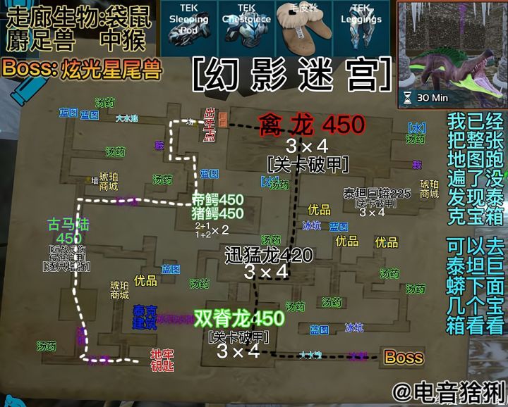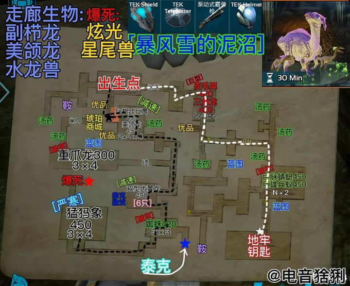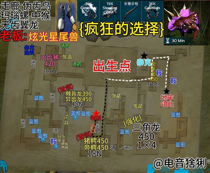 难度:★★☆☆☆推荐:★★★★☆本关重点:平底锅+流星锤+降落伞,带点啤酒硬莽过去就行.各位喜欢棘霸的朋友们可以刷了,有传说的353鞍具,泰克的话,手套是传说的,还有发电机和床返场了.{凶齿豨}带几个流星锤困住,打上巴的下巴有爆头伤害,或者是皮卡也行,但是比较耗护甲耐久.{棘背龙+异齿龙}棘背龙为首领优先击杀,异齿龙跑得和乌龟一样慢,站着不动他都打不到.{双脊龙}拿平底锅霍霍就行.{