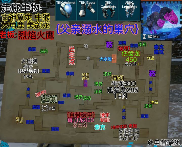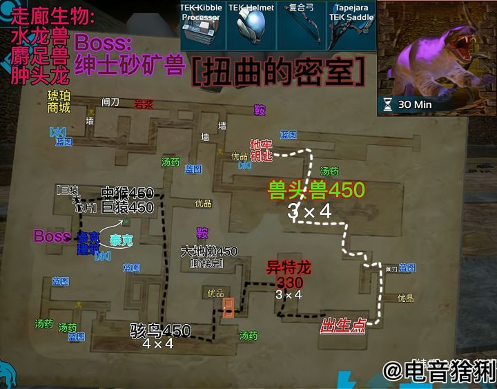 难度:★★☆☆☆推荐:★★★☆☆本关重点:推荐带平底锅打兽头兽,带火箭筒或者是剑这种范围伤害清理蜻蜓与双脊龙,带适当的兴奋剂,打砂矿兽.难度不大,奖励也不好,但是想要雷龙和恐龙的可以来刷一下,而且这里面可以出成品的泰克古神翼龙鞍.{砂矿兽+双脊龙}砂矿兽为首领优先击杀,带两个兴奋剂即可{巨型兵蚁+巨脉蜻蜓}不喝啤酒拿刀砍都行,兵蚁为首领优先击杀.{甲龙}等级低,但是血量较厚,浪费子弹,