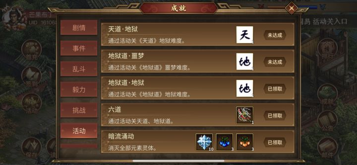 地狱道——地狱难度攻略——13群小回忆的master(建议先摸索打简单的攻略了解攻击路线)角色及配置:大概总共4个神将印、14个特技印、6个装备印记、秘典若干(8+)、爬塔3000层+(注:主要看作用,相同作用的可以用其他武将替代)(注:本文所有未标明真、圣的武器默认为二阶武器) 刘备皇天:作用:保左侧队伍、白虎消去队伍不良状态、魅惑敌人后消去敌人混乱状态、治疗左侧队伍、需要打伤害