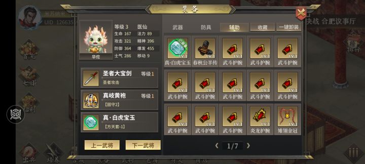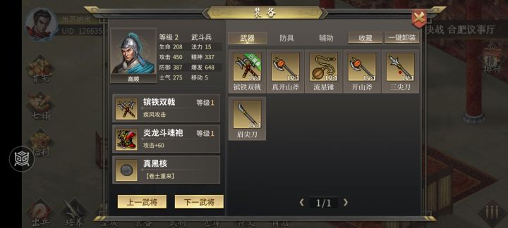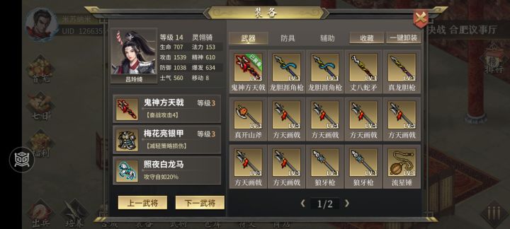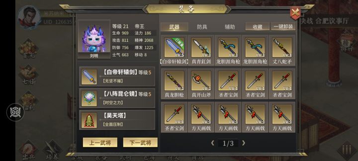 周目甩塔的人物&装备人物主要用刘明和吕玲绮,别人出场率不行。大沮在帝线出场率令人唾弃。刘明 武器:白帝轩辕剑(推荐)/孟德轩辕剑/轩辕剑推荐白帝是因为队友站在边上会加属性,测了一下快冲着20%去了,很好;孟德轩辕剑能有点非百分比的精神加成,近战强,配合先制挺好玩的,别人想打我自己先没了;凑不出高阶神器也没事防具:八阵昆仑(推荐)/八阵仙鹤氅/八阵鹤氅甩塔要靠精神,鹤氅就是