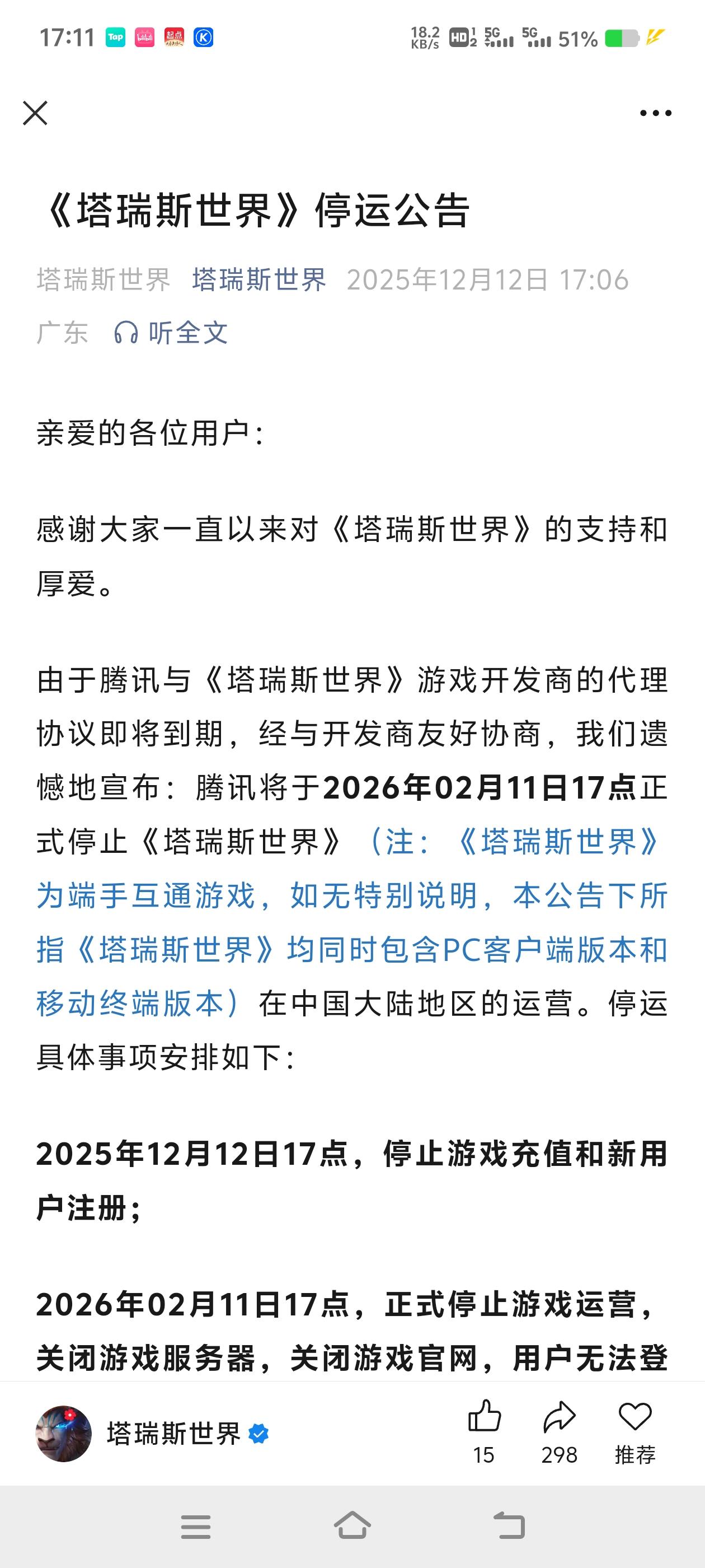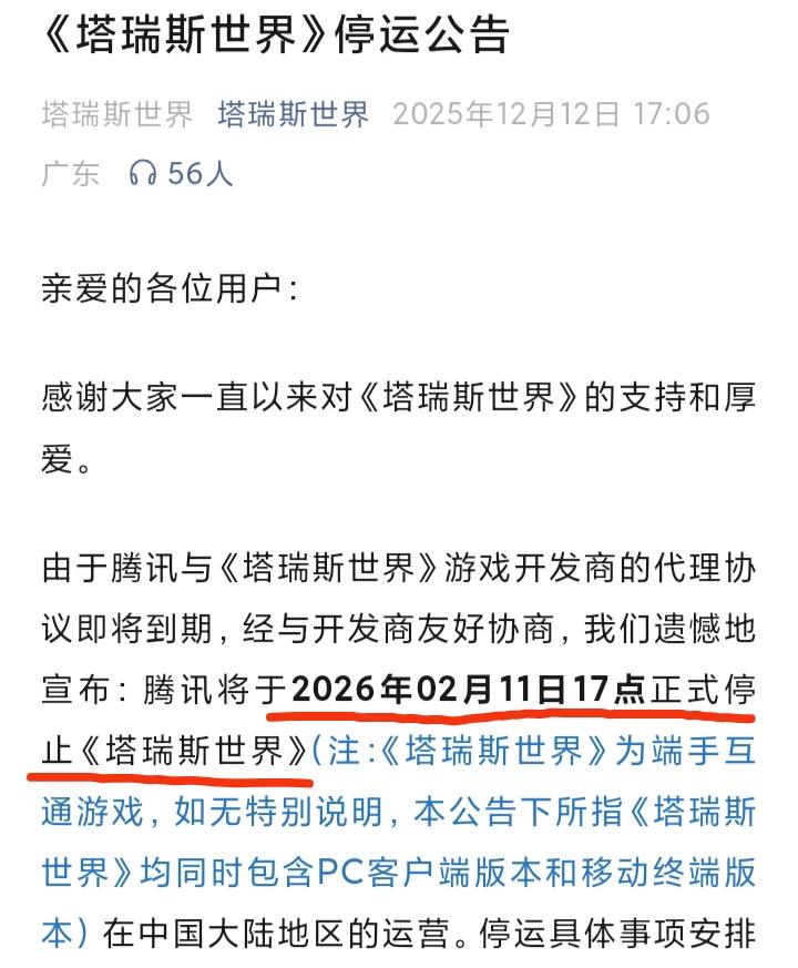 昨天腾讯突然发公告,说《塔瑞斯世界》国服要停运了。 官方给出的理由是跟开发商的代理协议到期,所以决定在2026年2月11号关服。 算算时间,这游戏从2024年6月上线到现在,也就一年半多一点。 看了下具体安排,从昨天下午五点开始,就不能再注册新号和充钱了。 等明年2月25号,官方的社群和客服也都要解散。 服务器一关,玩家辛辛苦苦练的号、攒的数据,直接就没了,说是会永久删除。不过官方也给了