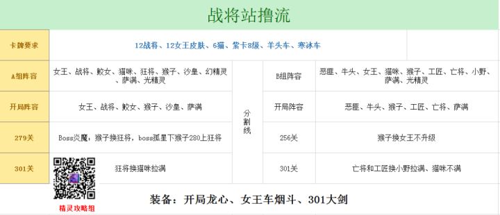本文首发【精灵攻略组】公众号,未经授权禁止“抄袭文章”转载至其它平台。 塔防精灵12战将站撸流来啦!今天小楼要给大家分享的是女王战将无脑站撸流赶快来看看吧! 卡牌要求:12战将、12女王皮肤、6猫、紫卡8级、羊头车、寒冰车 装备:装备:开局龙心、女王车烟斗、301大剑 A组阵容推荐:女王、战将、鲛女、猫咪、狂将、猴子、沙皇、幻精灵、萨满、光精灵 开局阵容:女王、战将、鲛女、猴子、沙皇、萨满