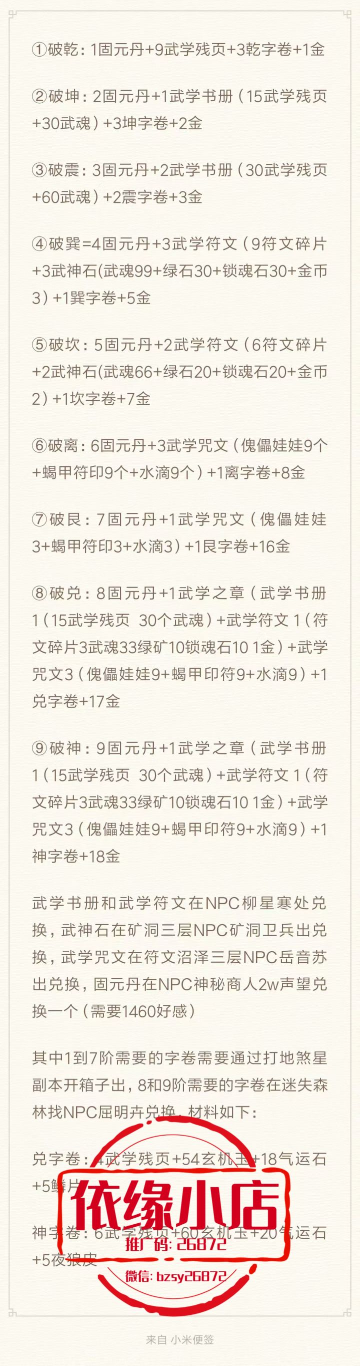 今天给大家带来近战武功破镜的攻略,除了基础武功外,其他武功修炼到满级都可以找NPC醉月翁破镜,每个武功可以破九次,每破镜一次,武功属性都有提示,增加维持,攻击等等,材料如下:①阶=1本秘籍+9武学残页+1乾字卷+1金②阶=1本秘籍+1武学书册(15武学残页+30武魂)+1坤字卷+2金③阶=1本秘籍+2武学书册(30武学残页+60武魂)+1震字卷+3金④阶=1本秘籍+3武学符文(9符文碎片+