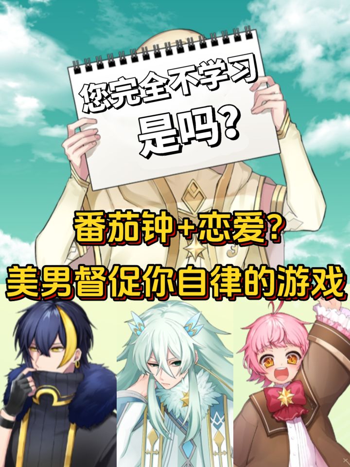 看我在TapTap找到了什么?美男陪学游戏!这不得下载下来玩一玩?开心游戏本质上是一个番茄钟,我们可以设定学习时间,放上几首能集中精神的BGM,在屏幕里的美男加油鼓劲下开始学习!学习后可以获得音律值,用来解锁人物,剧情,时装,礼物……学累了还可以进入休息室,玩一玩换装,摸一摸美男加好感,给精神充充电~游戏的缺点是立绘有点古早,比起现在的live2D,生动性要差很多,但是游