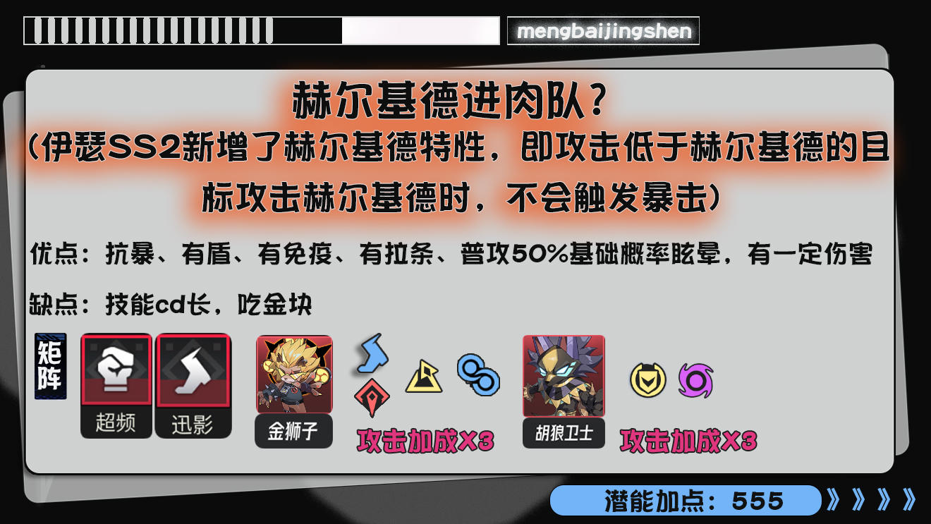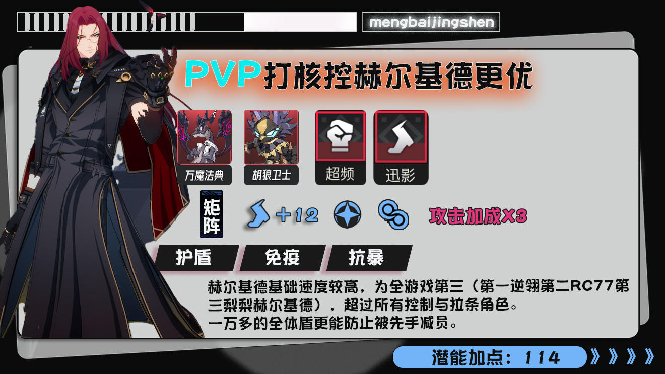再说一下我个人对赫尔基德的一些拙见,最后有个人打核控的面板,欢迎补充。不带浴血之躯的前提下,核爆夜离一个大秒不掉赫尔基德。所以我一般不带浴血(现版本即使肉队C一般也会堆暴击爆伤,真遇到那种全生命的提亚马特浴血用处才凸显出来,所以带浴血只能说可以防一手)比较推荐的定位是肉队副C,因为伤害机制比较差,不能作为主C玩,更倾向于补充伤害。(因为像水月真、赫同有反击,罗喉有协战,所以肉C其实除了本身