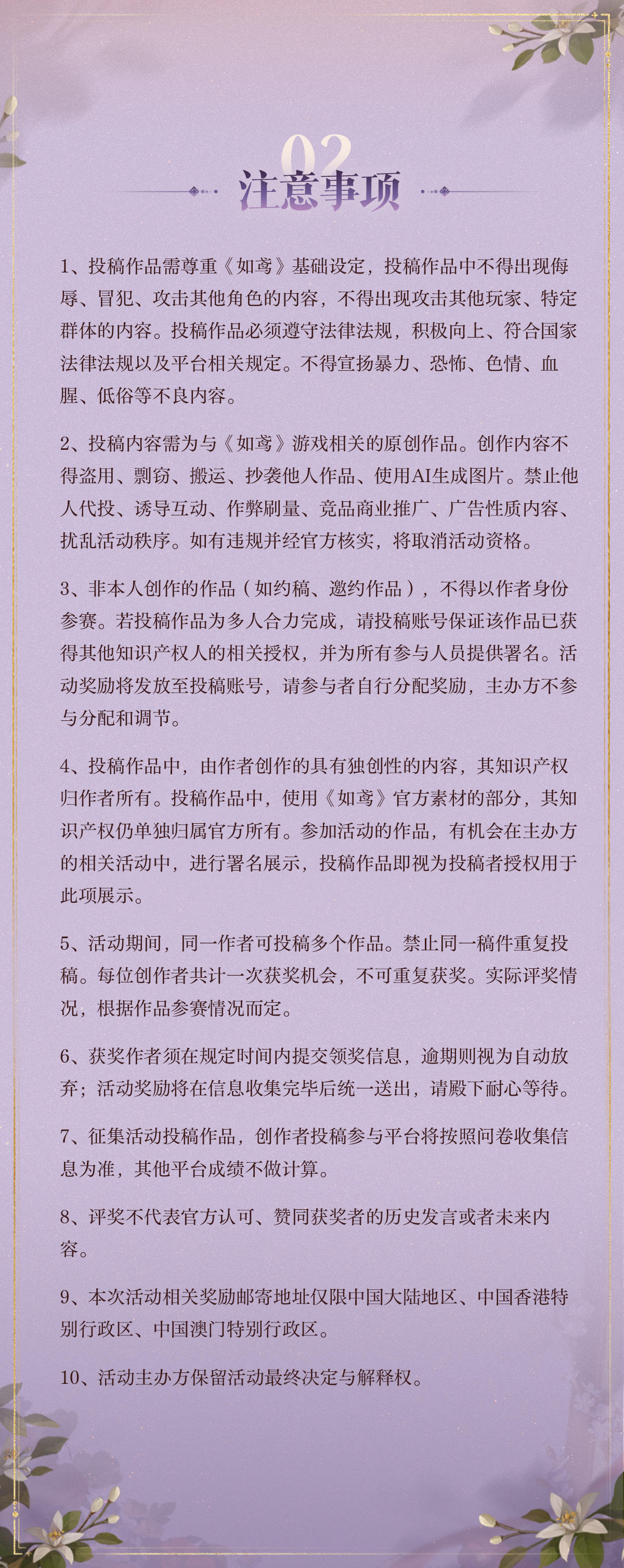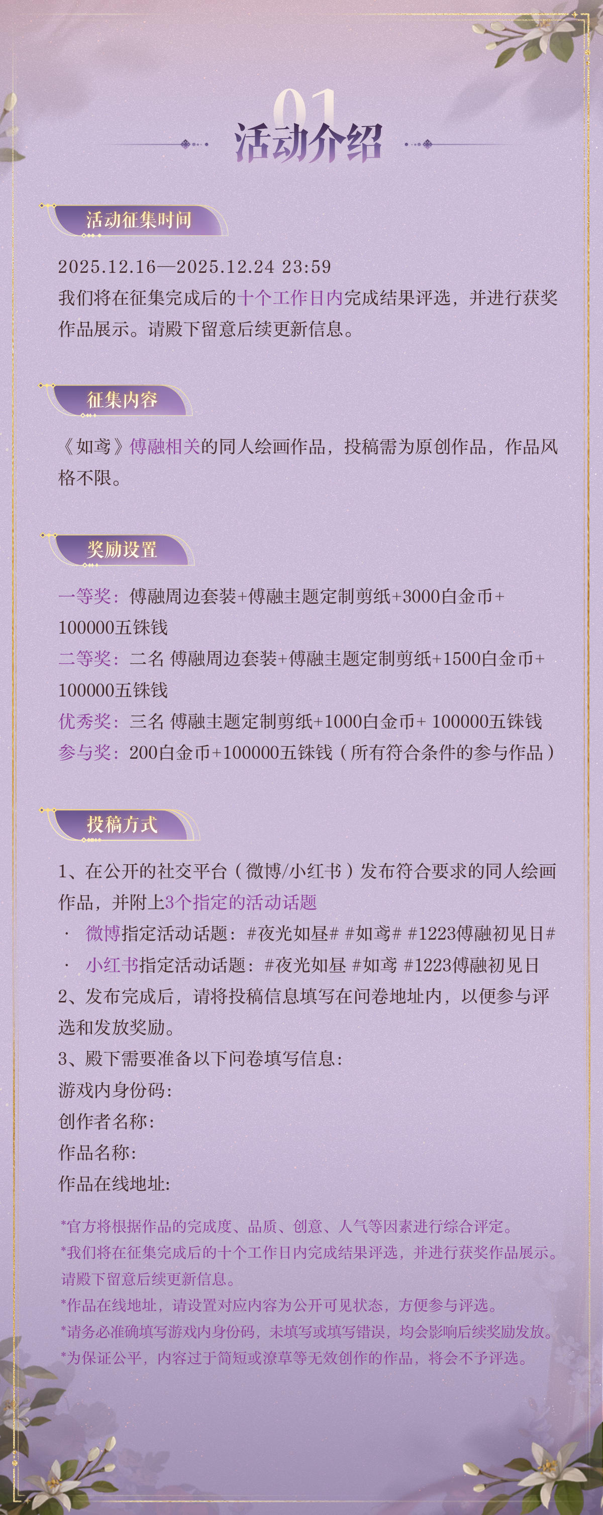 “山顶的辛夷花开了,要一起去看看么?”和他的初见日即将到来,“夜光如昼”主题二创活动现已开启。拿起手中的画笔,绘制独一无二的记忆吧~⏰活动征集时间:2025/12/16-2025/12/24 23:59我们将在征集完成后的十个工作日内完成结果评选,并进行获奖作品展示。请殿下留意后续更新信息。🎨征集内容:《如鸢》傅融相关的同人绘画作品,投稿需为原创作品,作品风格不限。🎁奖励设置:·#1223傅融初见日