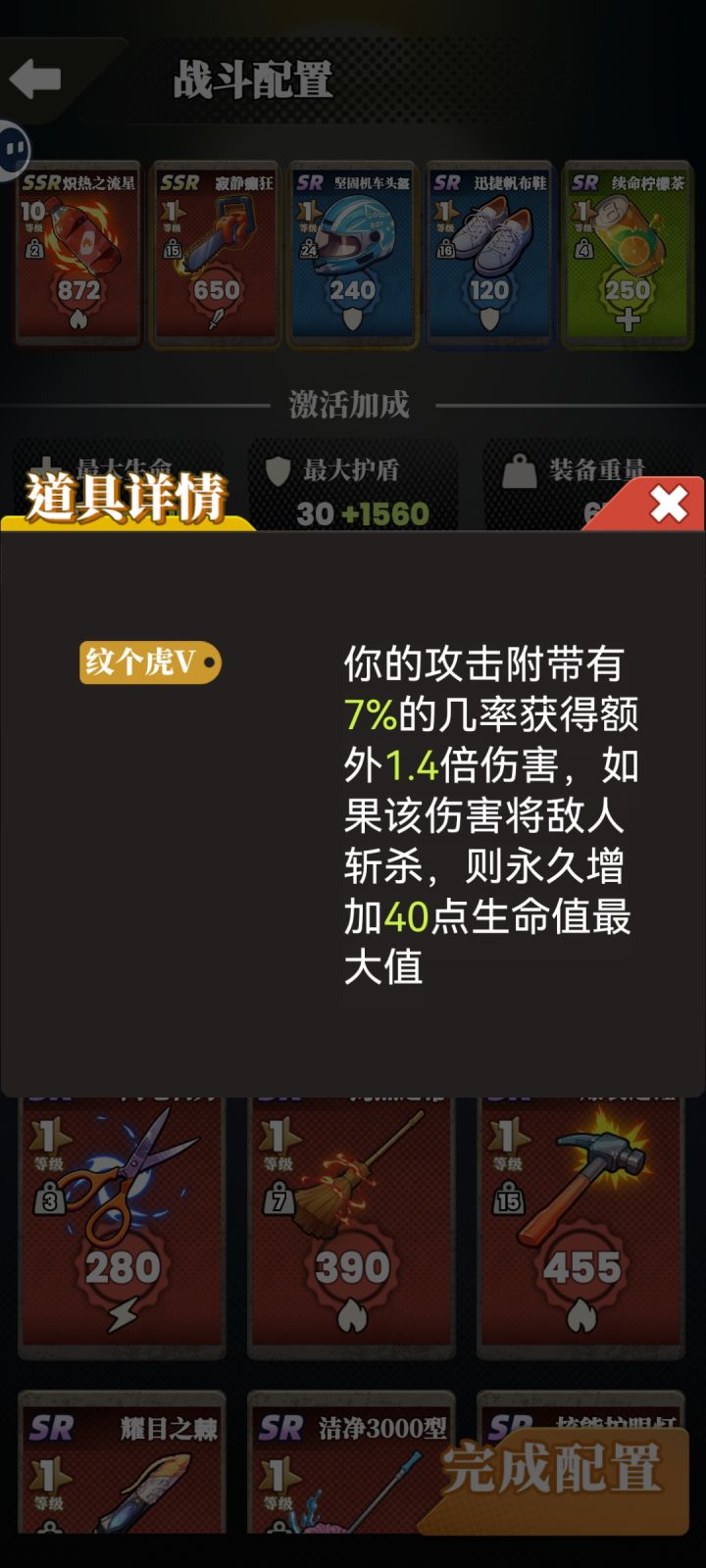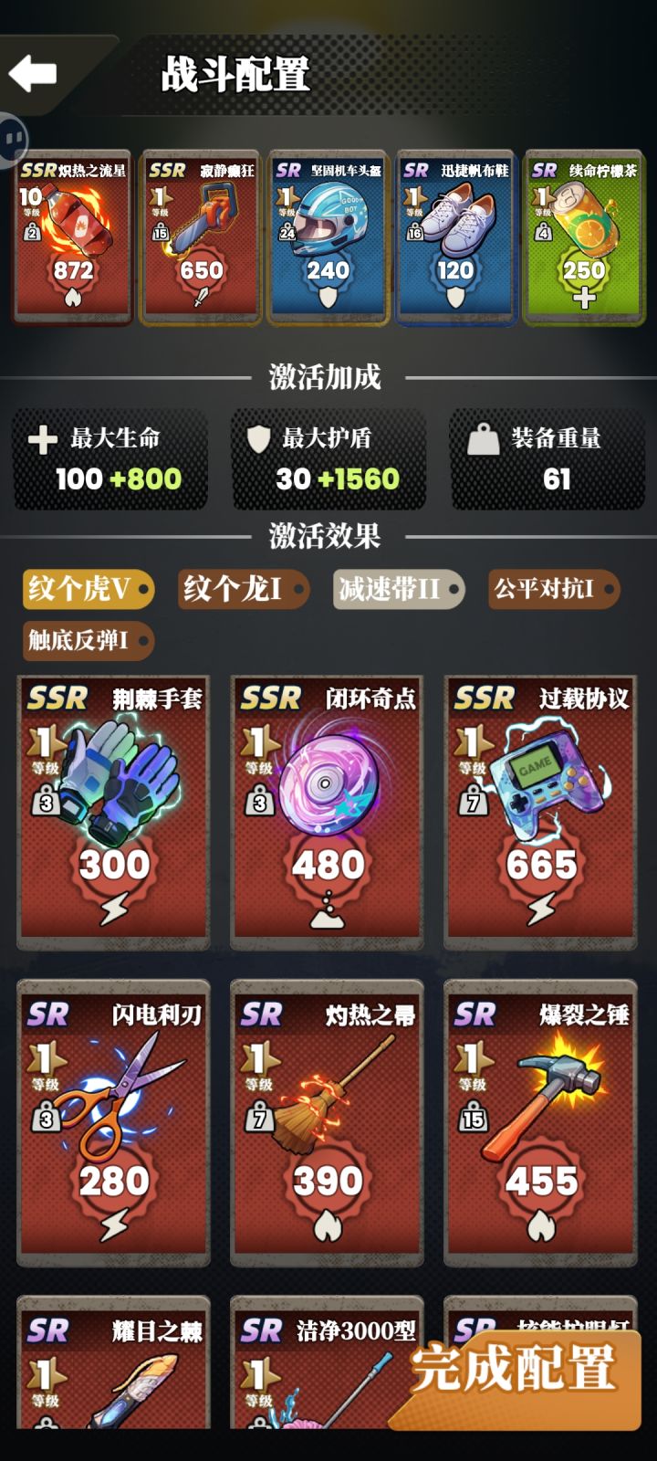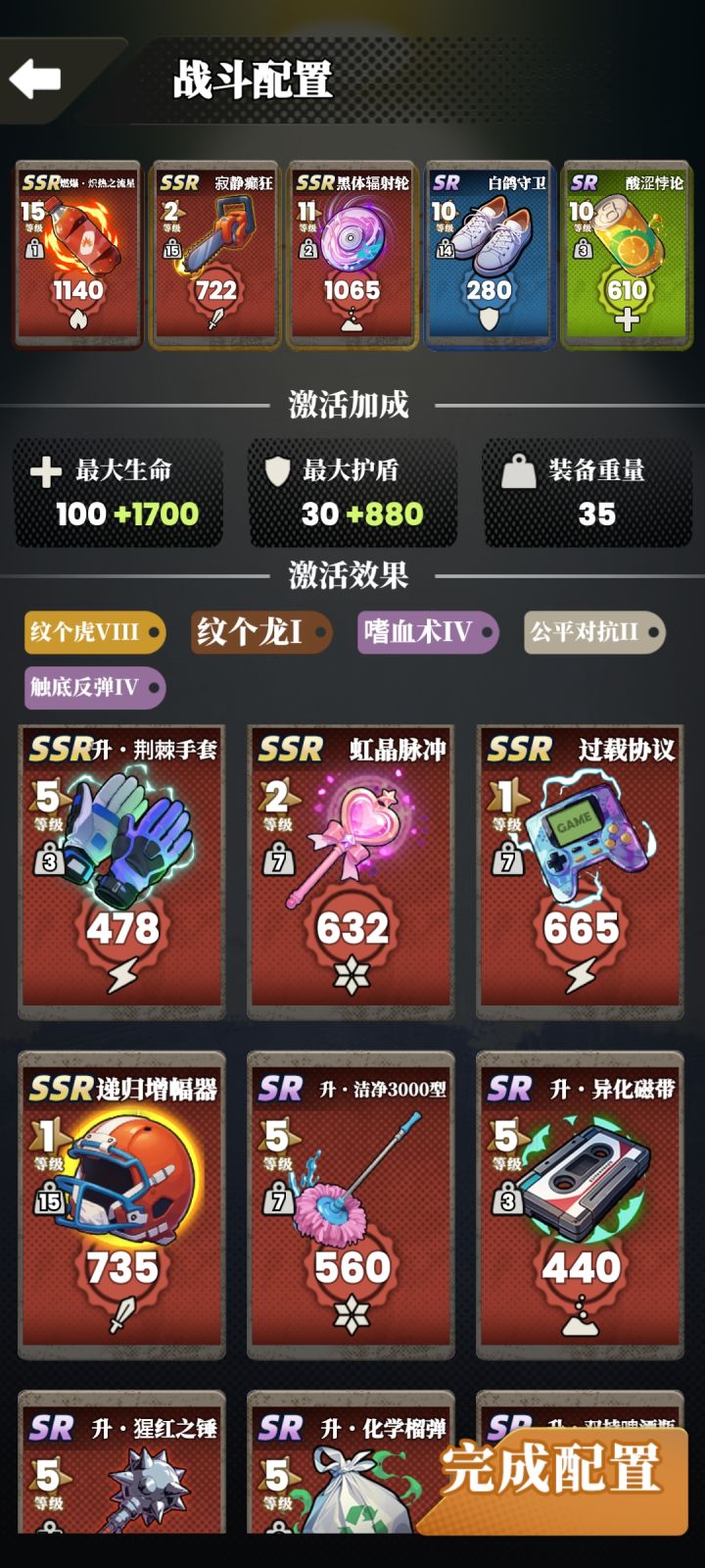 卡牌搭配分享及攻略 图一图二分享了两套 可以参考 激活效果中 纹个龙和纹个虎 概率触发 会永久增加盾和血量,前期非常建议带上这俩效果刷盾和血。 数据说明:①攻击力:就不说了②护盾和生命:刷怪时有盾先扣盾无盾扣血。③装备重量:影响攻击速度,重量越大速度越慢,有的怪速度很快,那攻击的时候就是对方先手。所以重量尽量选低的可以抢先手。④激活效果:点开可以看到详细介绍 龙虎前期必带,盾血刷够了的话,目
