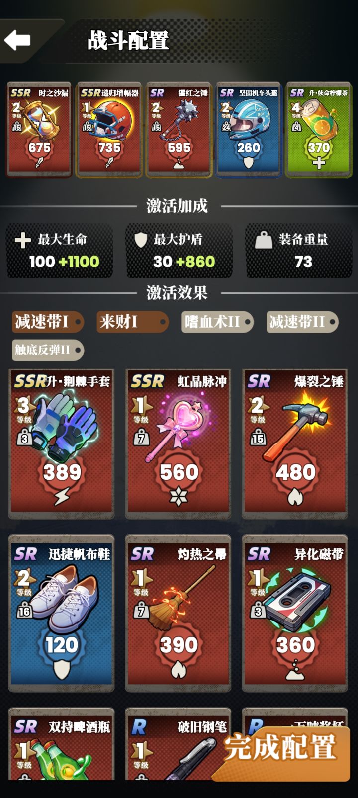 ✌️我管这套叫速杀流嘿嘿嘿✌️🔆除了速度特高的怪,这套速度基本上可以超过很多怪,打的很舒服,幸运的话可以秒杀对面不会被咬!被咬了防御回血量也够的,很难暴毙~👍👍✨最主要的续航输出就是飞轮和手柄,飞轮上吸血buff,手柄上荆棘buff~❗图上的蓝绿卡最好在到食堂副本之前升满级!不止是因为减重加速,食堂怪高攻,被食堂怪咬一口掉1000血还是很疼的😖,不升满的话可能状态回不上😢❗想靠先手秒杀对面
