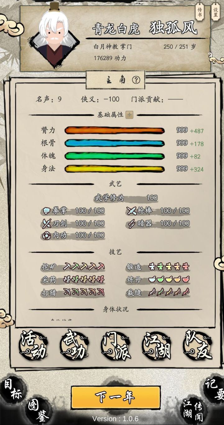 ♦条件:裸奔开局,无经脉。 ♦偏向:速刷、尽量少看广告、不sl。 ♦适合:萌新、初学者。 ♦目标:尽快刷十万功力退隐攒真元升经脉到满级。 ♦十万功力条件:一本金外功满级、一本金内功满级、金色武器、金色护甲、四维属性接近999。 ♦建议:门派任务还是可以适当sl的,内功过渡用一本催魄即可,多刷宝藏拿装备,多修行练功攒武学经验升级秘籍。配合☀长生门从入坑到入土☀(负侠义流)一起食用更佳:#游戏种草计划#游戏安利