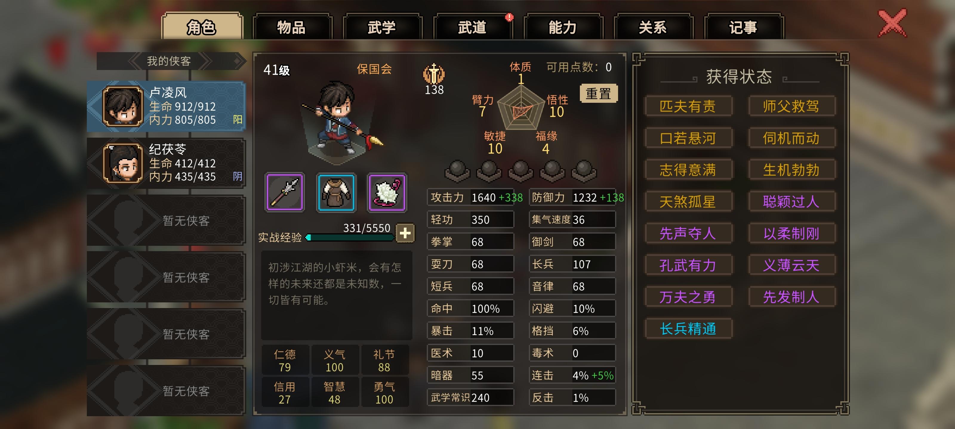 新生代人物中,断崖式领先的存在,任何武功一学就会,且饱读诗书也非常聪明。(当然,前提是主角帮她治好病。)现在回过去看的话,第一武学天才我原以为是独孤剑一,因为独孤剑一的原型可能是独孤求败。没想到是凌梦蝶。(好像不能说这话,不然护妹狂魔——凌鸿轩 可能会来揍我)#大侠立志传 #大侠立志传手机版