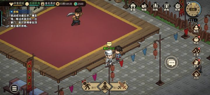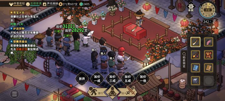 抢竟宝大会注意点:1在做完九流任务前看看自己队伍配置,没三个能打的趁早收手,把任务搁置下来拉练度。(三个九流完成后大会三天倒计时就会开始)2大会开始后,进图前存档用来刷宝物,抢完一次可以把东西放家园,而且回档不会消失(一周目存取一次)3把默认的每场开自动战斗关了,自己站到门口把门堵了再开始,留一个最肉的原地蓄力堵门。#大侠立志传 #大侠立志传攻略 #大侠立志传赚钱攻略