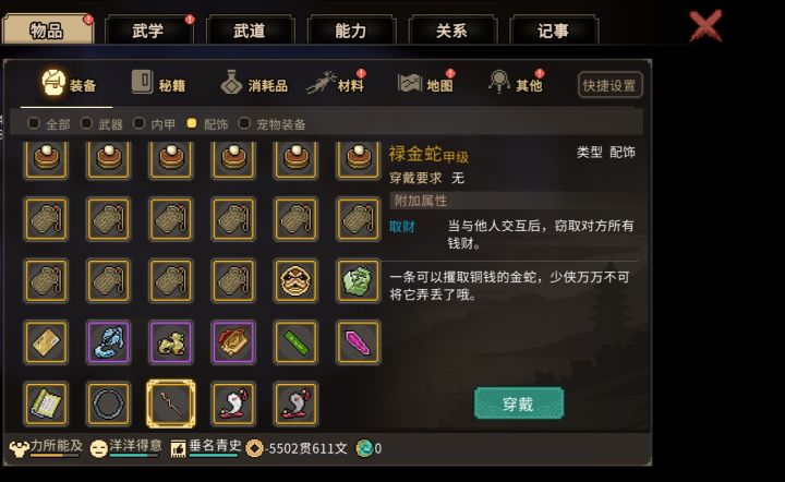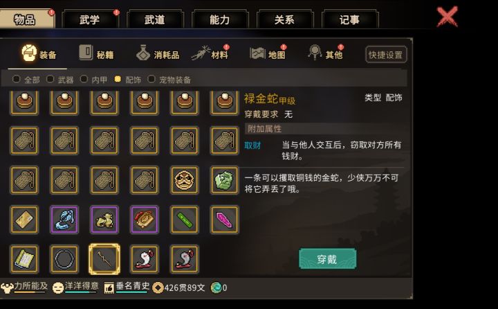装备禄金蛇,和商家购买东西金额会变负数,越买得多负数越高,对话结束最后禄金蛇功能生效,亿万负翁不是梦#大侠立志传bug