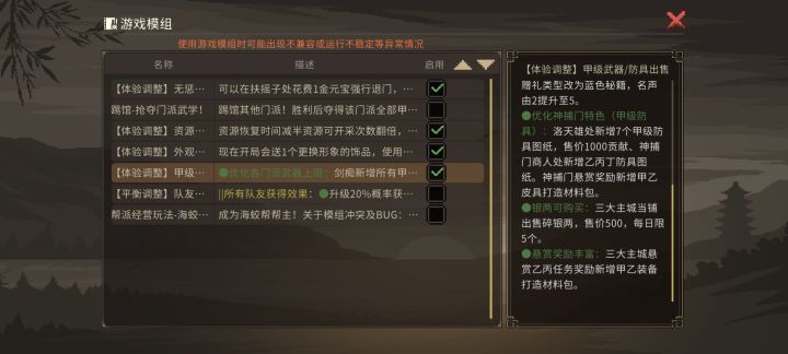 这个mod有Bug,开了会让所有衣服金色布材料变成绫(只能靠衙门悬赏随机开出来,原来拍卖会产出那个金色的布会直接废掉),还有这个杀了宠物也得不到第二张金色虎皮熊皮,导致神捕门卖的图纸完全没用,没有材料去做。许愿移动端打牌mod(封盘20次拿千王之王实在太坐牢了,开局不拿每次都要花几个钟头录屏去搞)求求官方和大佬看看窝 #大侠立志传mod #大侠立志传bug
