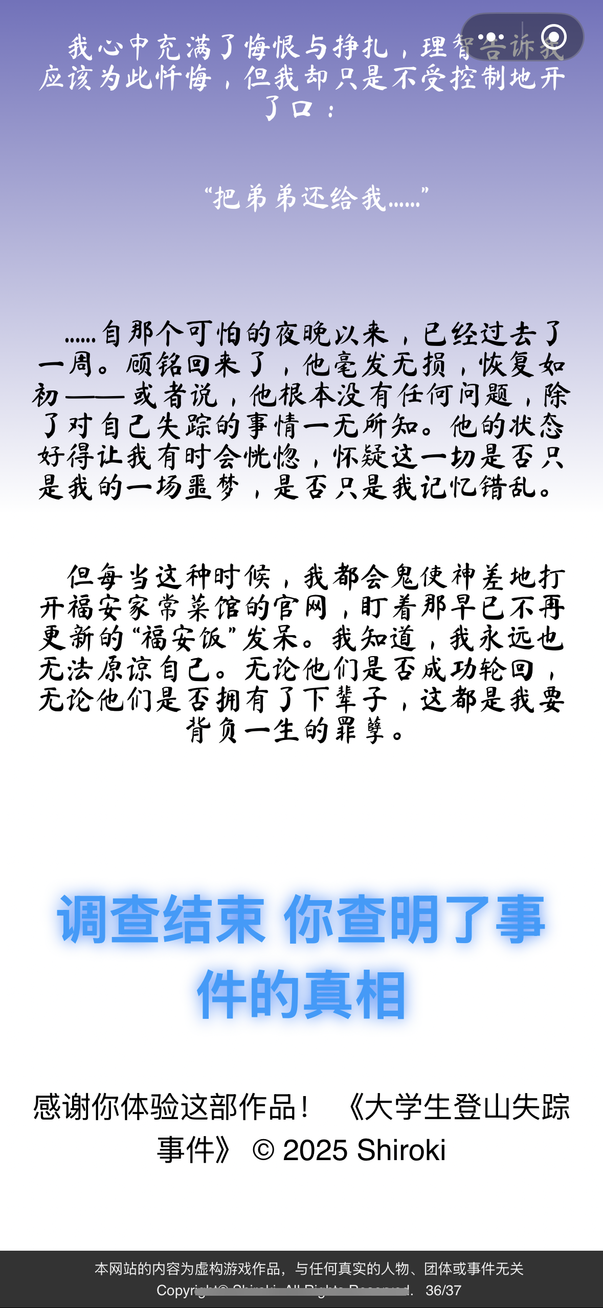 游戏入口:https://missing.shiroki-y.top/introduction.html攻略链接:https://whimsical.com/MtANUHzKzsREuZqN8RX89r游戏时长:1-3 h《大学生登山失踪事件》是一款中文网页推理解谜游戏,2025 年 9 月 13 日免费发布,无需下载安装,电脑或手机浏览器即可游玩。玩家需要扮演失踪者的姐姐,在给出的网页里