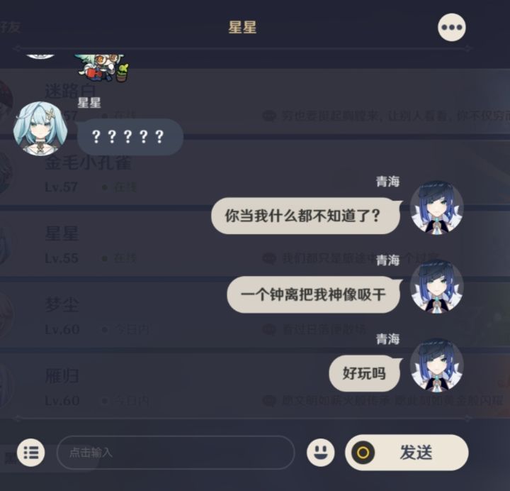 这个人第一天来我世界的时候我在做一个三个炮的任务,然后他开始让我用炮打他,他用的钟离我没注意,看他没掉血,然后他说好玩让我试试我就去试了,结果夜兰直接没了,还追着我打,我赶紧传了七天神像。后来他和我道歉然后还带我找宝箱我想着算了先留着。结果今天我在鹤观有个怪快打不过了他刚好请求进来我就答应了,打完之后我去过剧情他突然说我神像回不了血了,我当时觉得不对劲,然后一看果然他的钟离直接把我的神像吸干了,我
