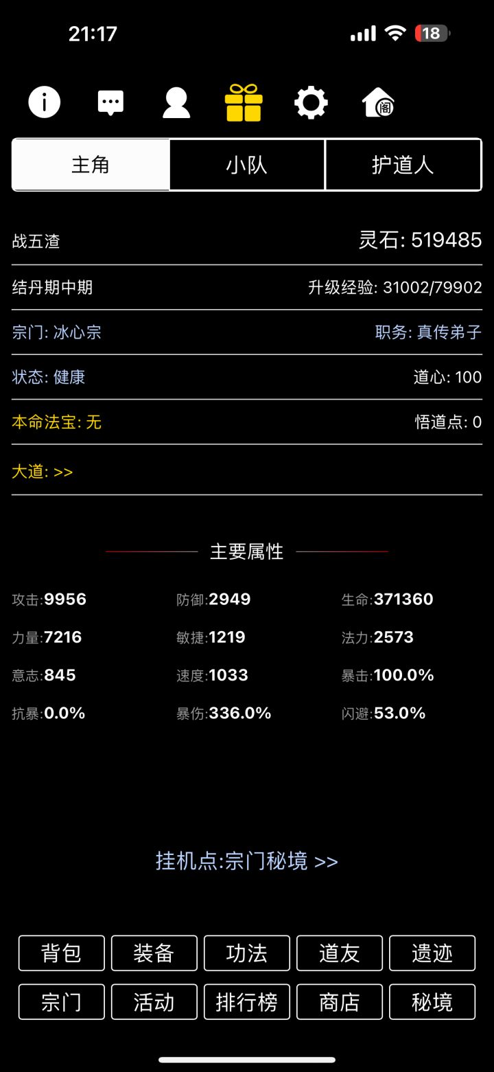 昨天刚玩了一天,其实一开始玩的还好,玩这个游戏,一个人玩,玩不出什么玩意儿,还好有宗门前辈指导,葱选择宗门,到注册好系统自动赠送2个护道(最好元婴)到一直在元婴秘境刷装备,然后买宗门“应该是老大们留下来的福利”最少的代价买高效率的护道,我应该说通过大佬们的指导,度过了入门,现在才开始玩,游戏本身感觉还不错,因为之前玩过一款文字修仙游戏,上手起来不太难,既然开始,那就慢慢修仙吧, #天敌对战 #天敌