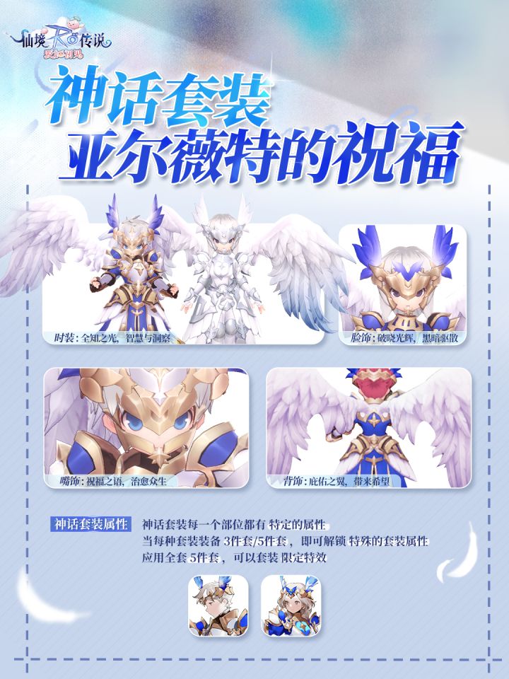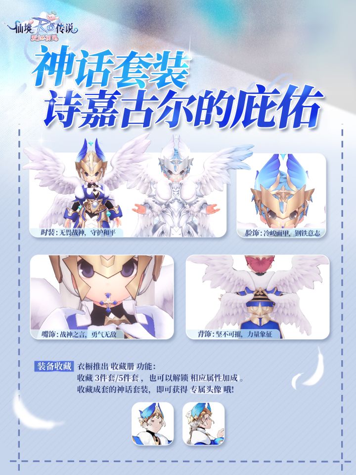 全新神话套装【诗嘉古尔的庇佑】&【亚尔薇特的祝福】已经登场!🌟诗嘉古尔的庇佑超经典骑士装配色!将天空和海洋的颜色凝在战袍上,白金蓝的配色颇显贵族气质。炫目的星光镶嵌在盔甲,幻色翅膀充满魔法的力量。以女武神的灵魂,一同前往神圣的城堡,来一场轰轰烈烈的胜利吧!🌟亚尔薇特的祝福在被白雪覆盖的神话世界里,勇士们银白色的盔甲闪着几分寒芒,巨大的翅膀映上几分天空的蔚蓝,钻石般闪闪发光。无垠的天空下,众