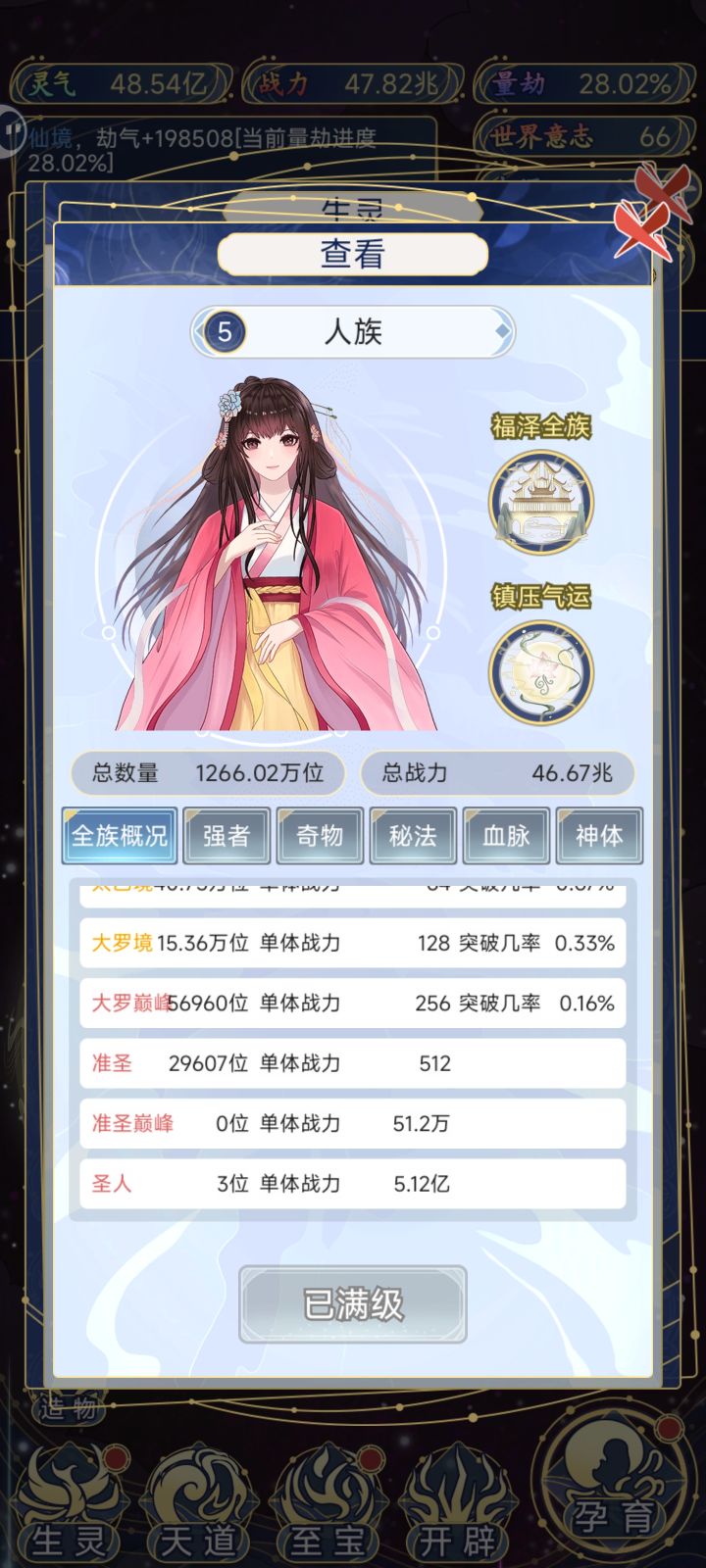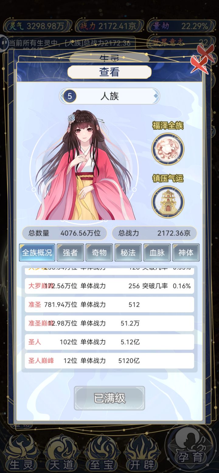 #天道创造 #天道创造各位大佬 看到了攻略里有大佬神体战力能上5000多,我就试着升了下人族,直接两眼一黑。不过那个大佬用的是红色种族,我也试了个红色种族的,升满也不到5000,好气啊。。。