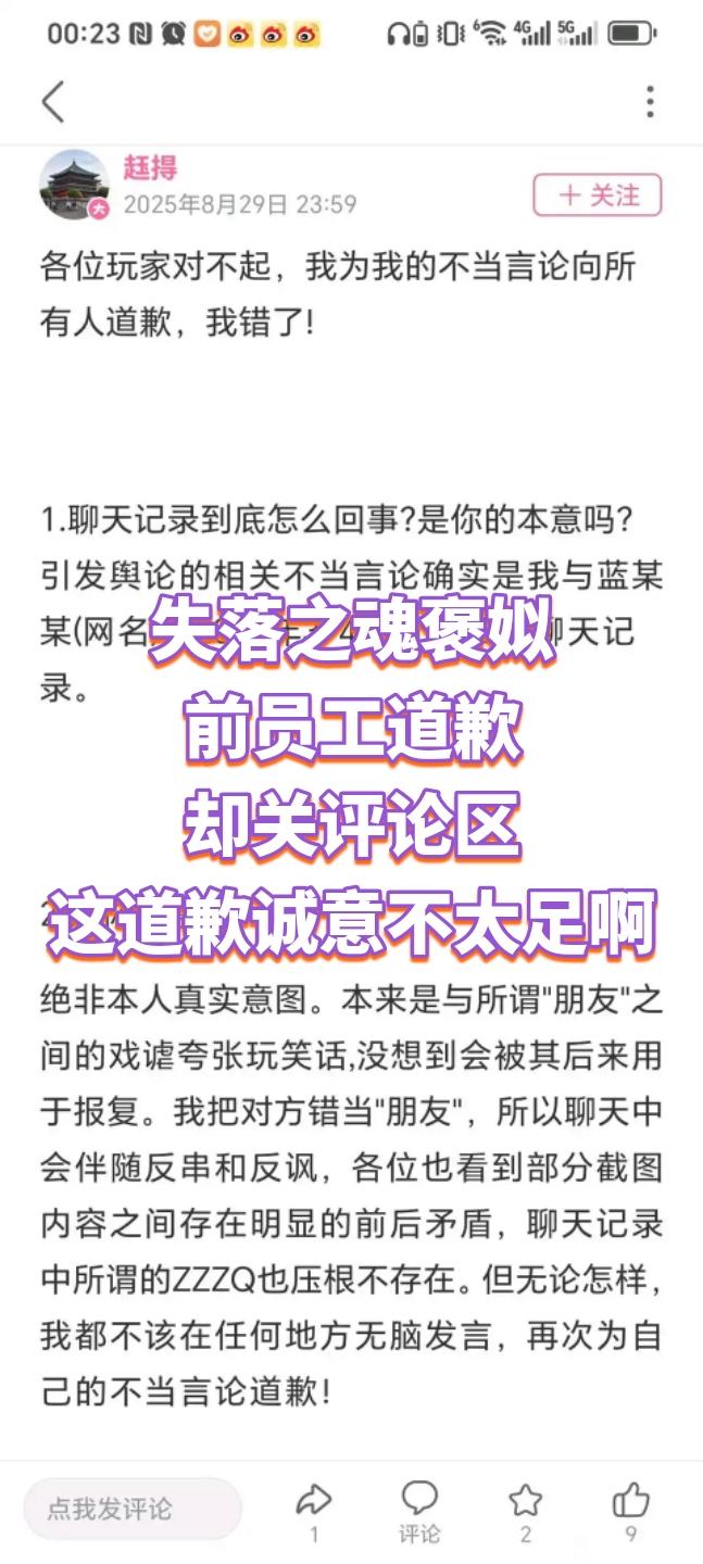 失落之魂前员工道歉却关评论区,这道歉诚意