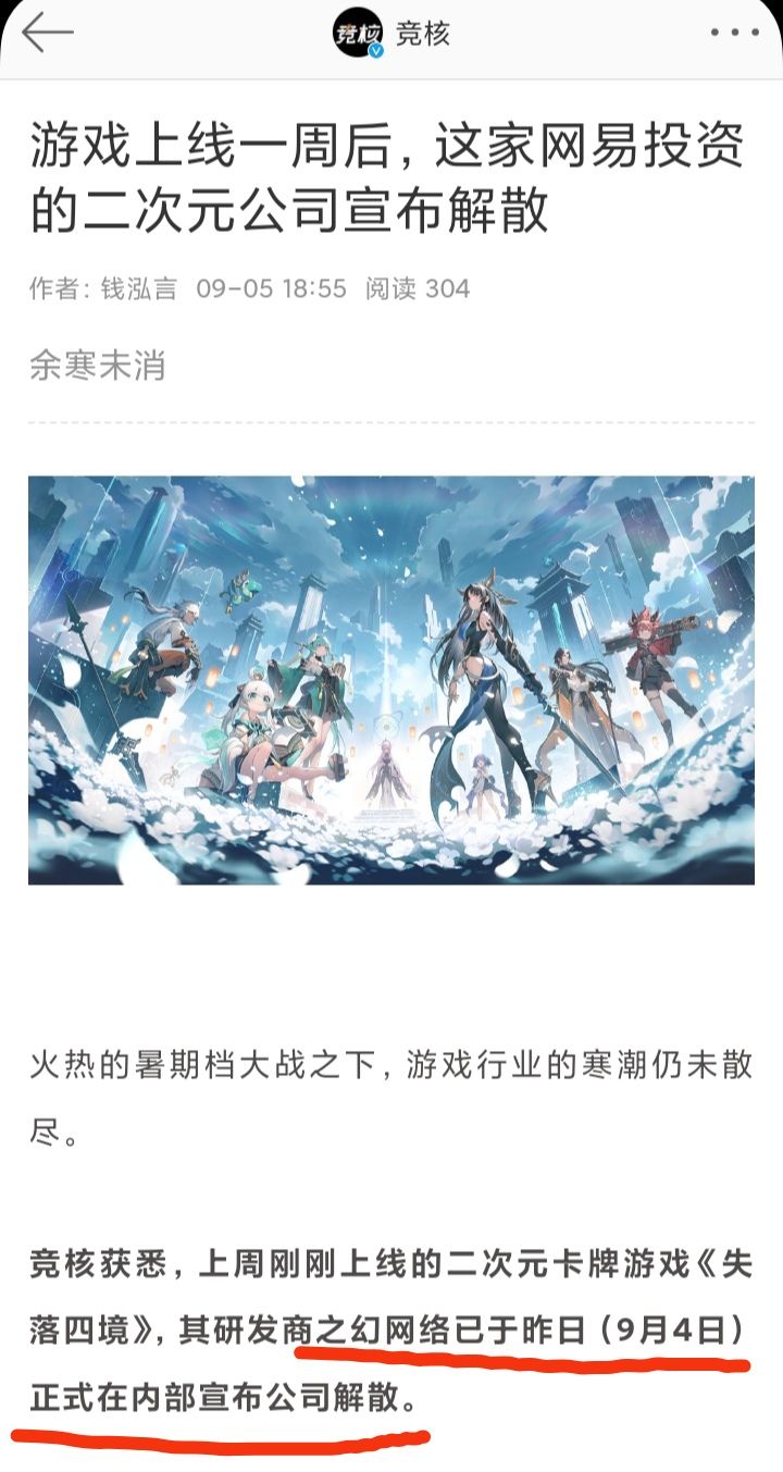 9/5号晚,国内游戏媒体发文称,《失落四境》的研发商——之幻网络公司已宣布解散根据TapTap信息,《失落四境》刚首发一周时间,下载数仅5.8万,确实成绩不好之幻网络的倒闭,再次告诉了我们一个真相:二次元游戏赛道是又拥挤又残酷比起游戏停运,还是公司倒闭更沉重,不知道大家怎么看待这事