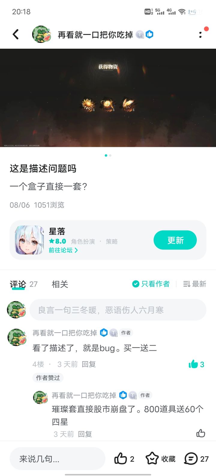 一开始玩的号,锁定69抽强歪了,后又开的号新手30没出五星,剩下邮箱和送的也没出,然后又开了个,如图3,up池30抽四个五星。。#星落 #星落喜欢 #失落星环定档7月26日 #星落震撼篇 #星落节奏榜 #星落开局送一百抽 #星落配队
