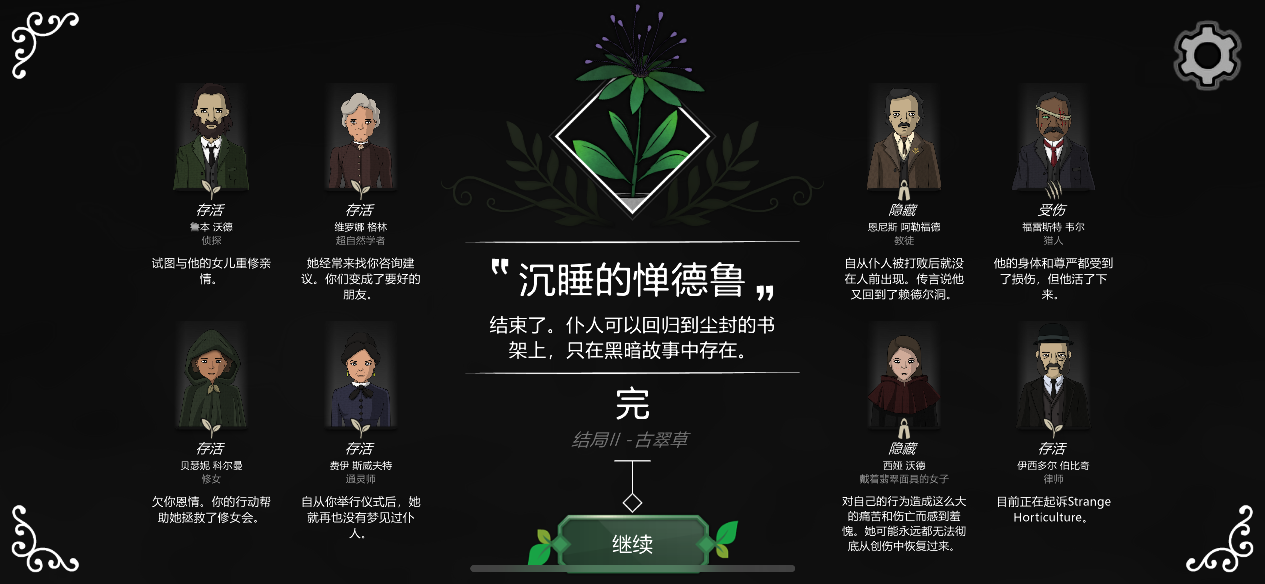 首通~,记录一下,中间都是随心选的,好歹全员存活,后面试试走死亡线会怎么样 #奇异园艺