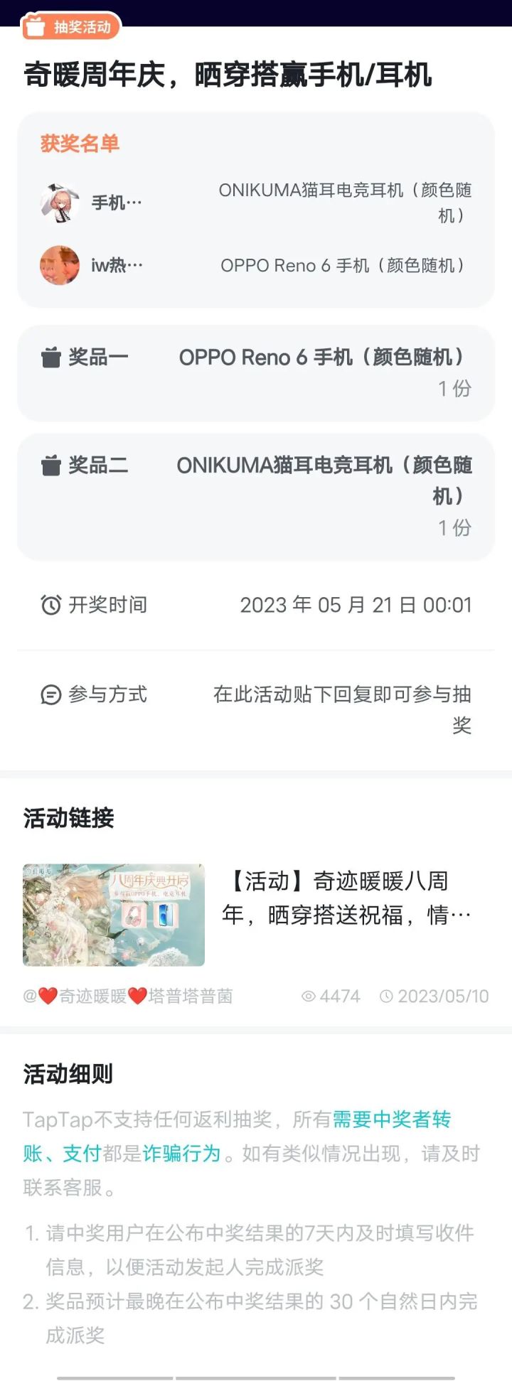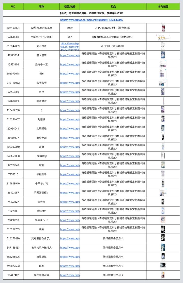 非常感谢此次活动的开展,感谢❤奇迹暖暖❤塔普塔普菌,很荣幸获得手机,所有中奖信息已填写发送给了tap领奖的qq,祝大家也好运连连,锦鲤附体,收到实物会发给大家看。#奇迹暖暖#奇迹暖暖八周年