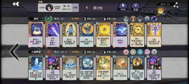 我一般练气不D牌(除非都是加灵气的“印”,遇到过一次),也不炼化牌(1.练气筑基南宫不是特别强,需要合牌拉质量,2.前两回合掉血不痛不痒,3.除非前期质量高,不想掉血,或者赌先手)金丹期必选“五行爆炎”元婴和化神仙命不好说,看习惯(我喜欢加修为或者抽牌)下面主要是金丹和元婴过渡摆法(金丹)🌱木灵秘印:(元婴)🌱木灵秘印+🔥灼心:(筑基)💦水灵秘印:(金丹)💦水灵秘印:(元婴)💦水灵