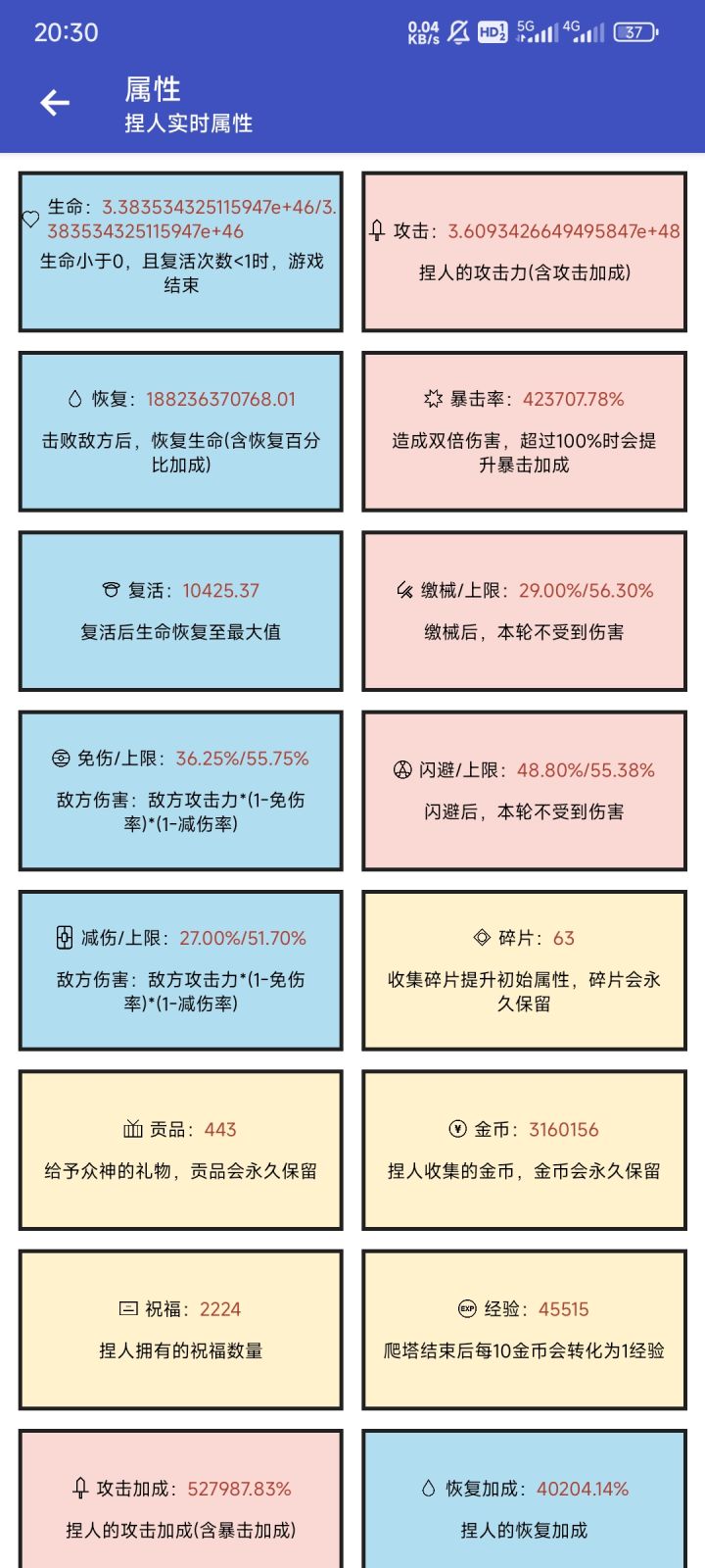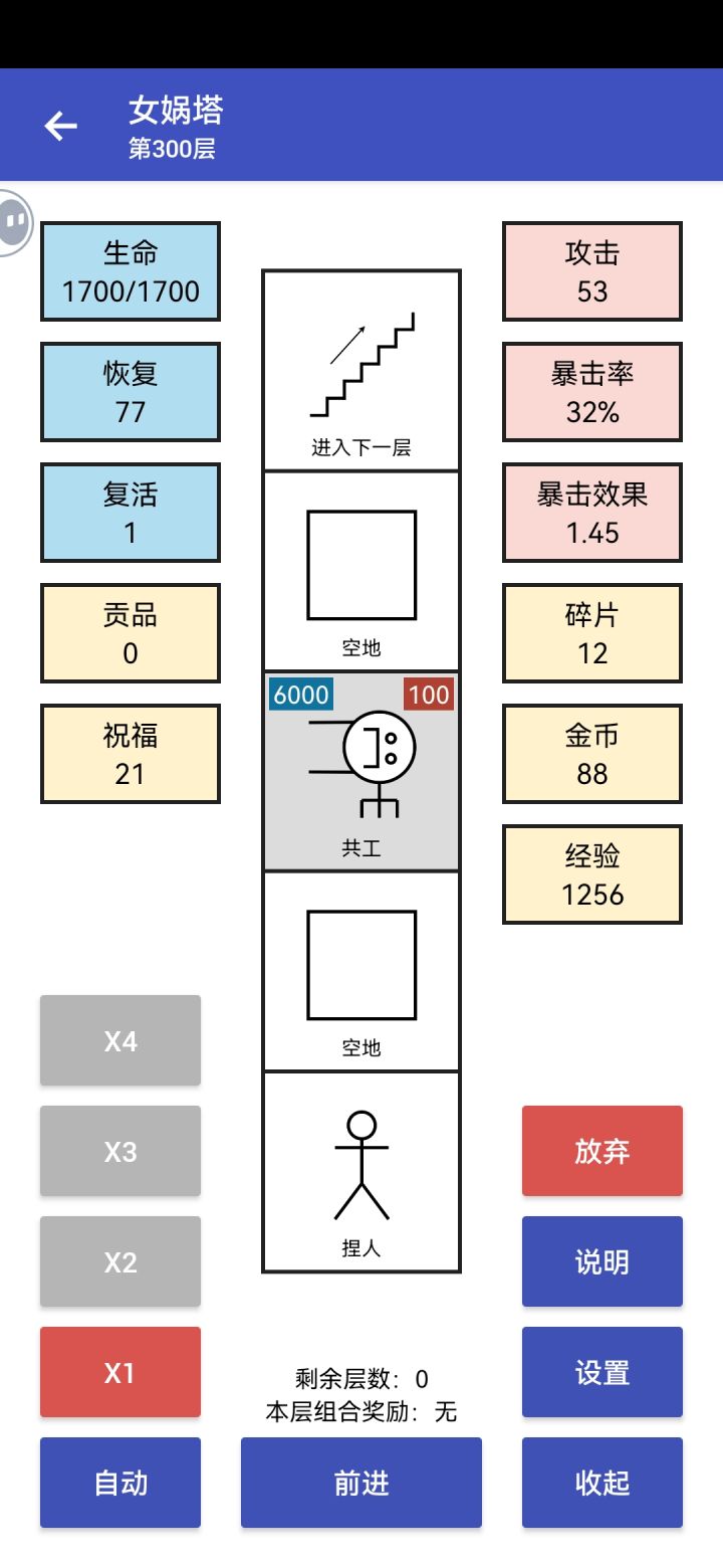 #女娲捏人 数据到1e21 就不显示了。方法还是基于我之前说的刷生命理论。主线刷到850层刷不动了。支线一般能到5000层,理论计算如果是传说商店+6%,应该轻松到7000层。但后面会越来越慢,且慢慢死亡(复活慢慢减少)。后来想到后期生命核心本来就是商店+3%,所以利用存档不停刷商店。5000开始刷到5500(中间也不是每层都是商店。)电脑自动点击工具+自写python脚本。刷了两天。生