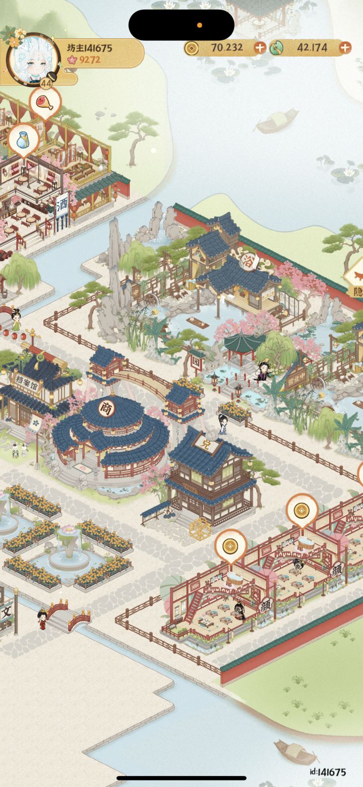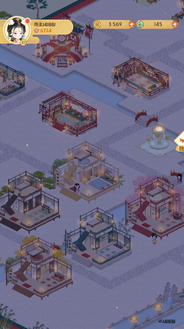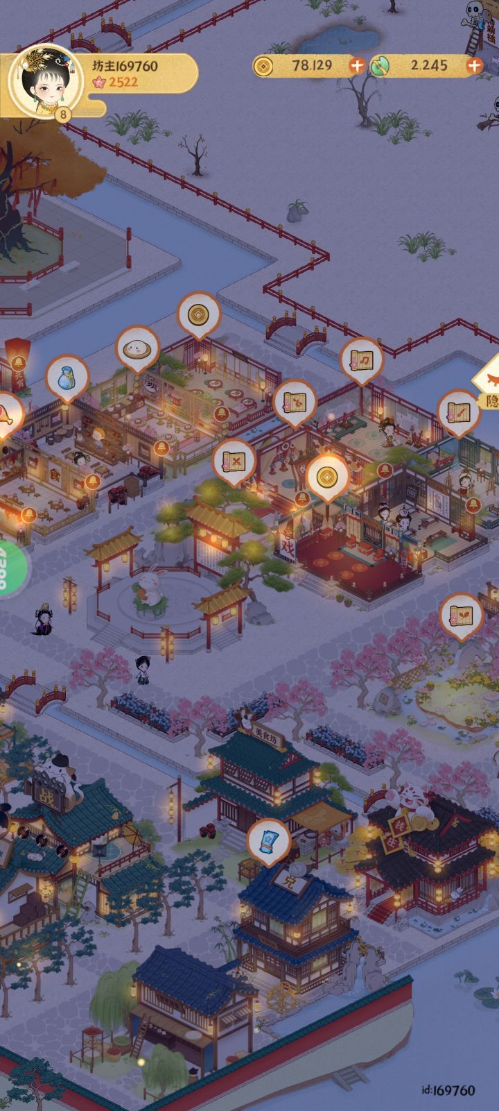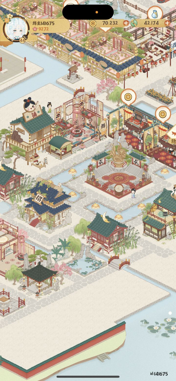 已上传作品赶一下乐坊布局末班车主要思路是按建筑颜色冷暖进行区域划分填补建筑→填补灯和植物→修路(先全部填满水路,然后修改成石板路主路和一些围栏)→布置小景长安雪后似春归 积素凝华连曙晖祝大家蛇年开工大吉求赞求推荐 感谢各位#女子乐坊布局大比拼 #某某朝的女子乐坊