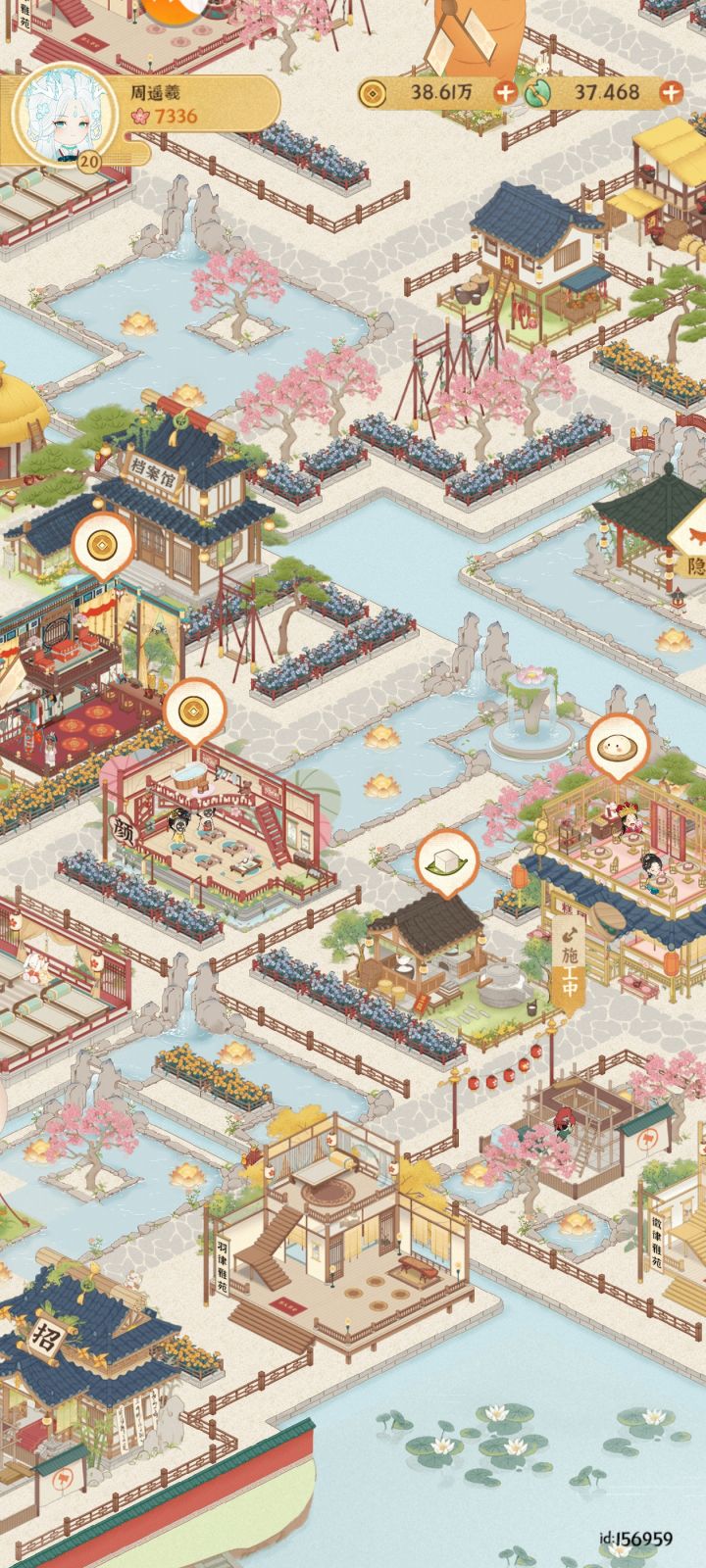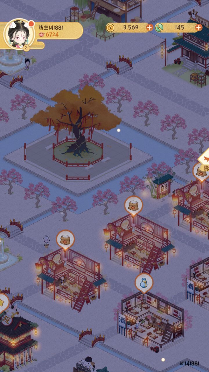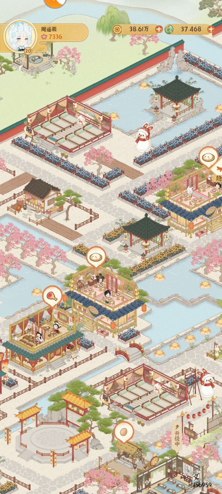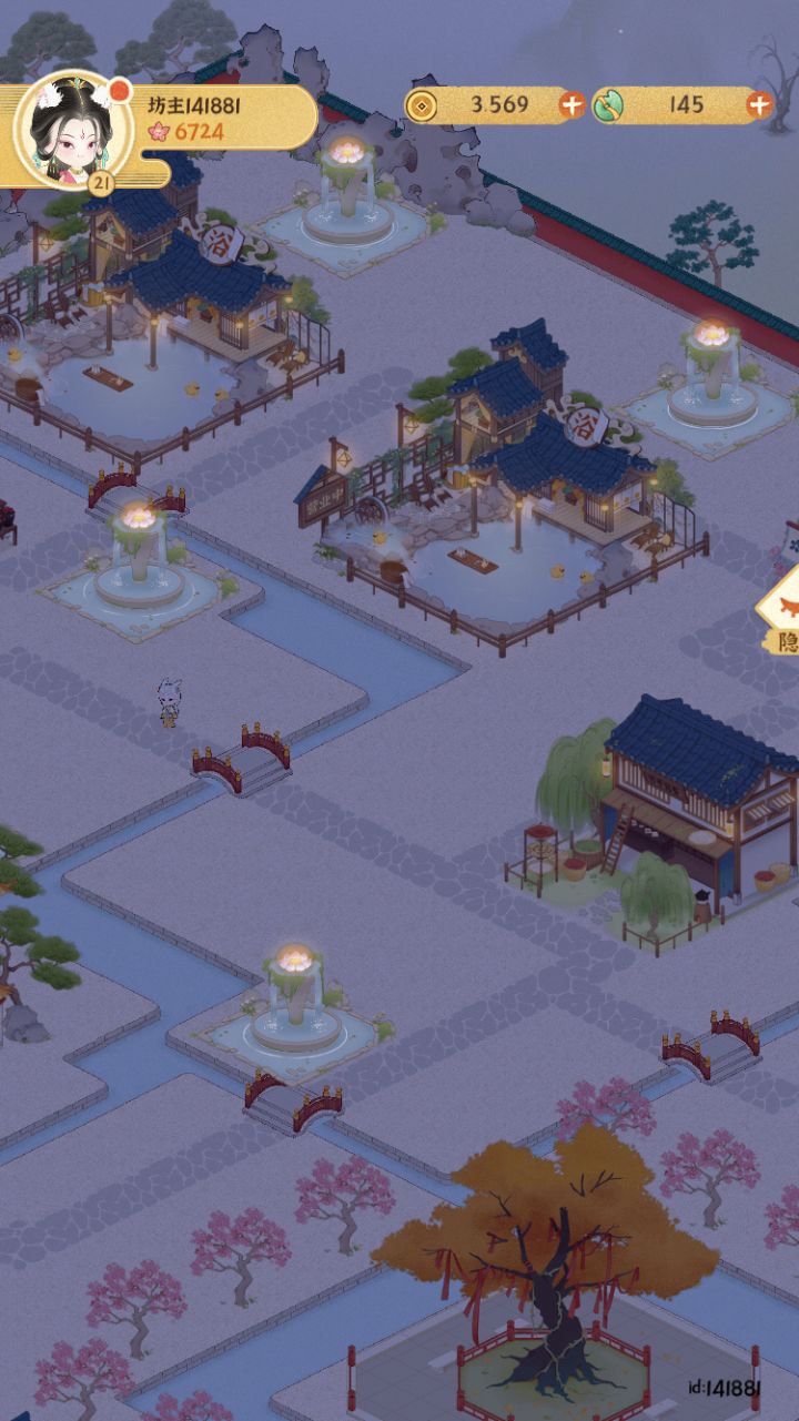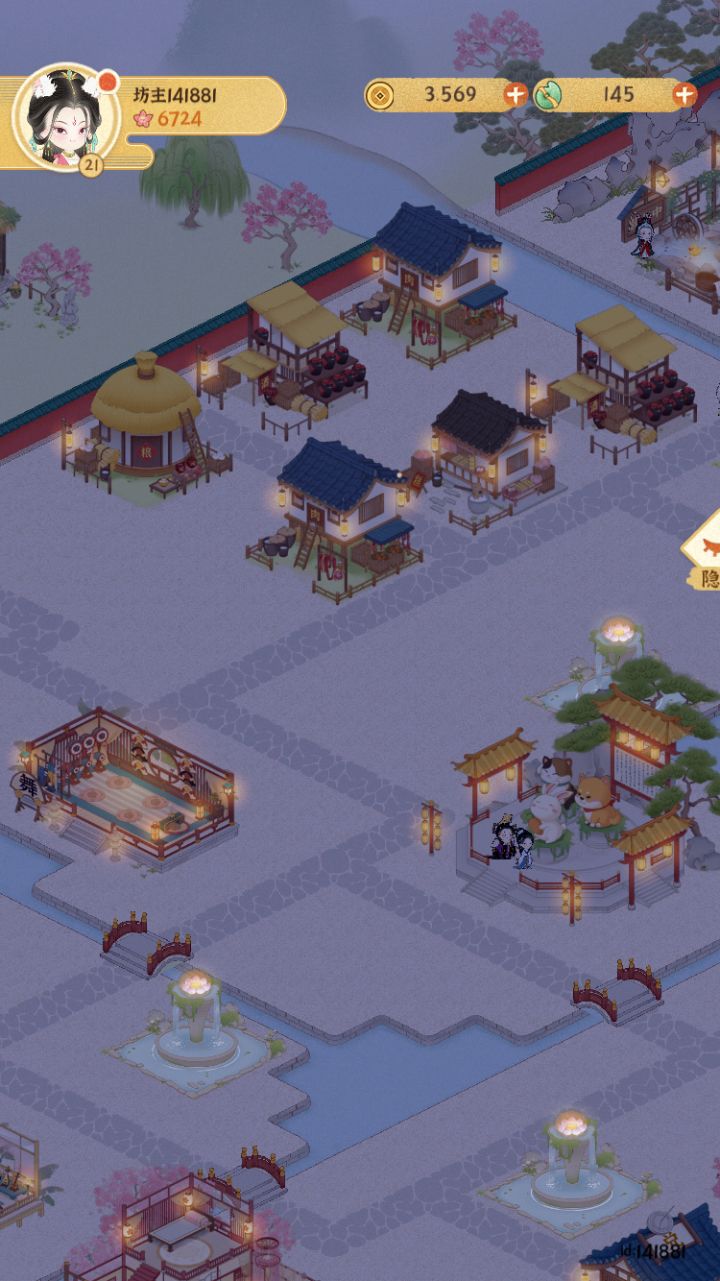已上传作品赶一下乐坊布局末班车主要思路是按建筑颜色冷暖进行区域划分填补建筑→填补灯和植物→修路(先全部填满水路,然后修改成石板路主路和一些围栏)→布置小景长安雪后似春归 积素凝华连曙晖祝大家蛇年开工大吉求赞求推荐 感谢各位#女子乐坊布局大比拼 #某某朝的女子乐坊