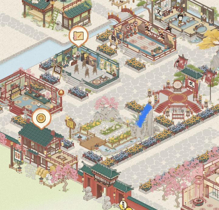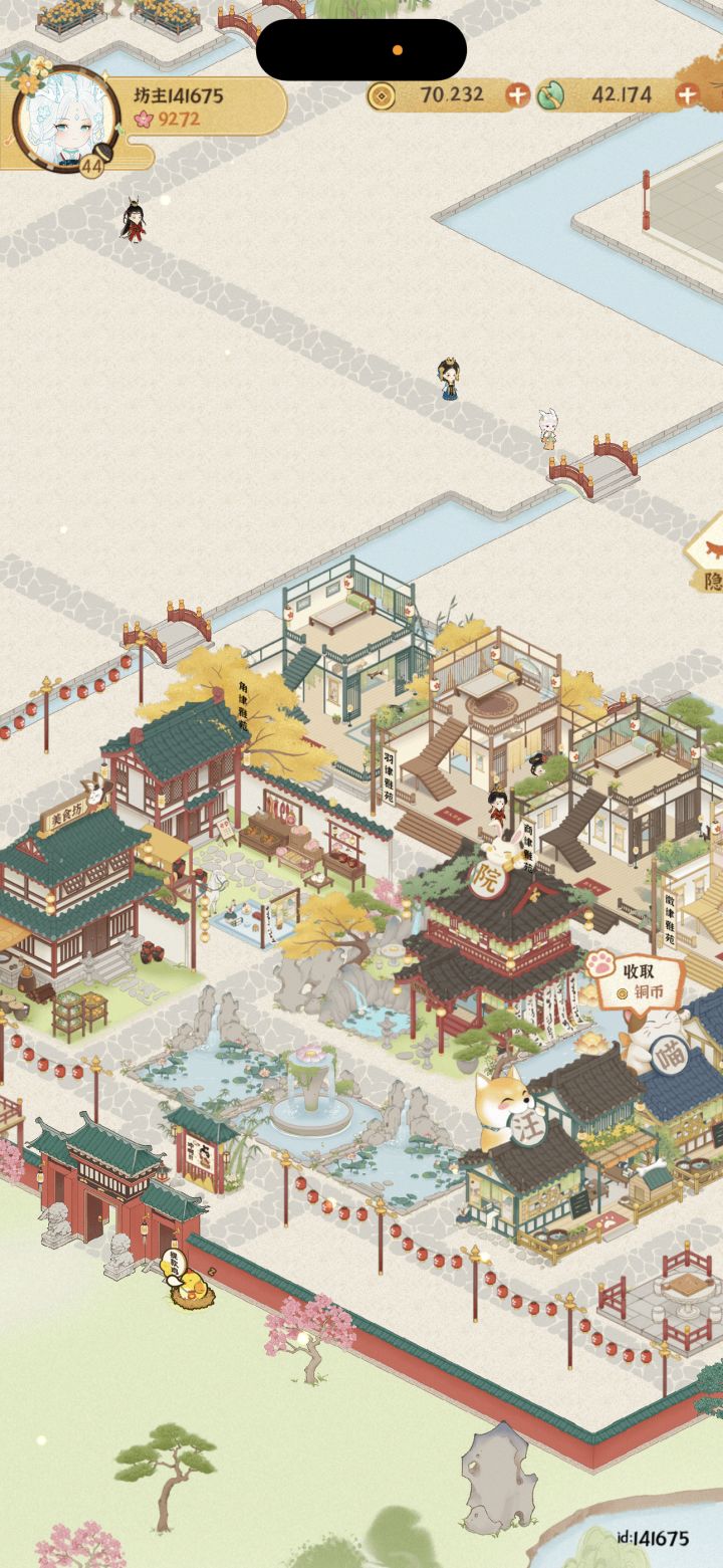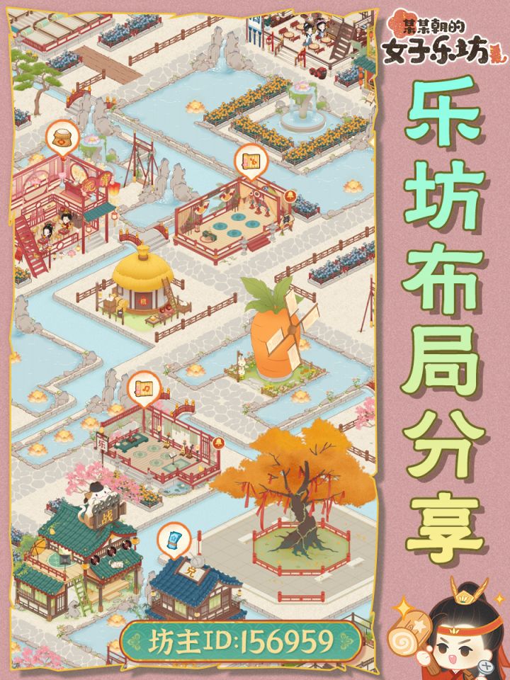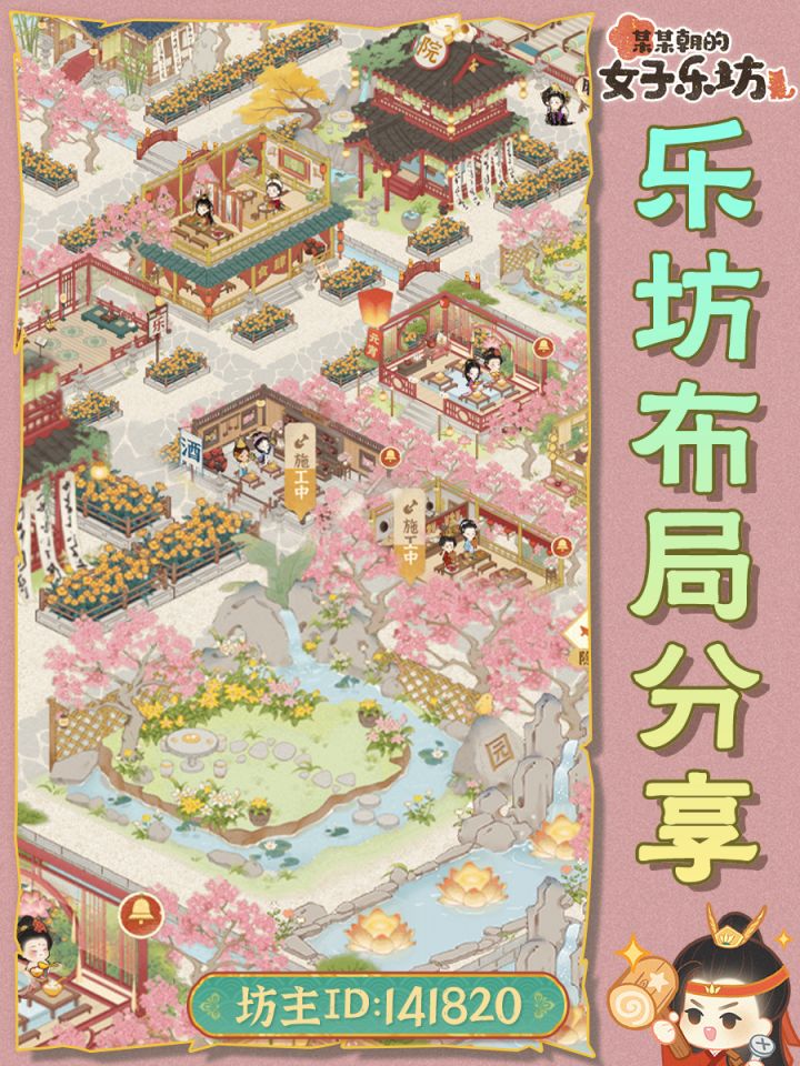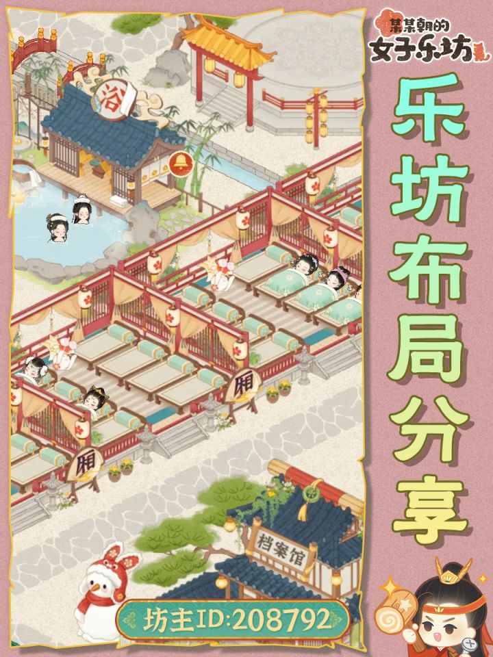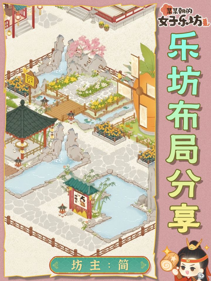 布局思路:前排喵汪舍,方便一键领取,后面太乐院,作为主院进游戏就能看到,太乐院后是资源区,排整齐就好,然后是弟子厢房。太乐院左边是雅苑区,便于领取好感度,其他建筑摆放见图,美观就好。#女子乐坊布局大比拼