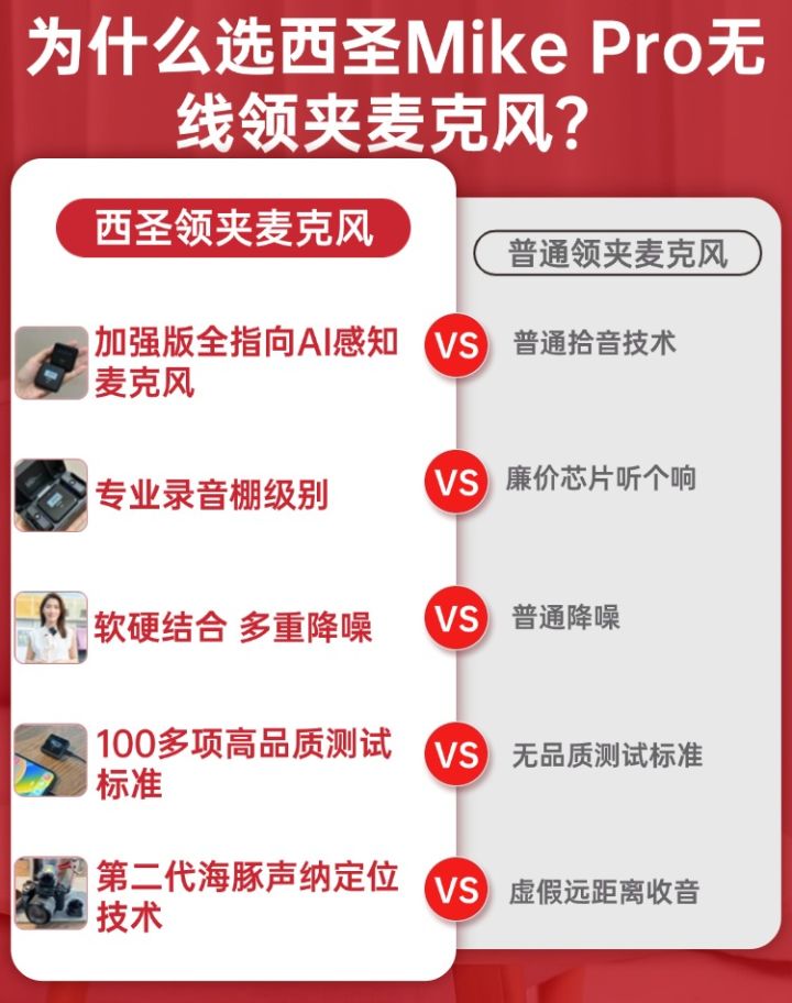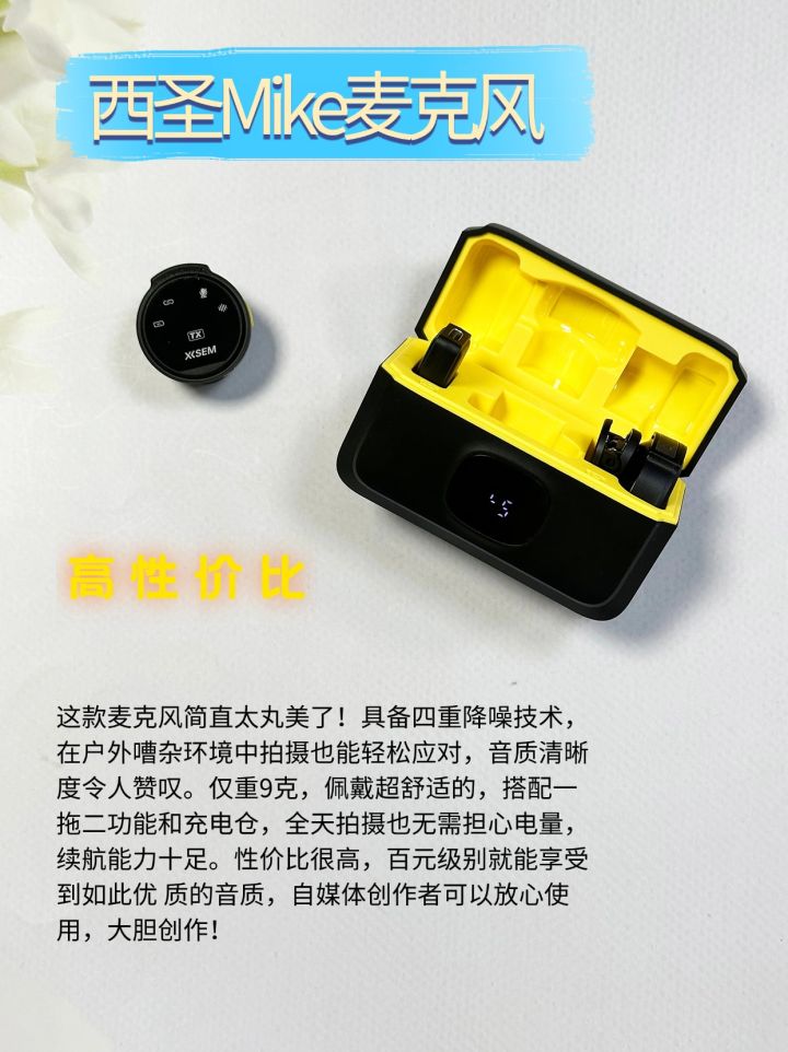 选择西圣Mike Pro无线专 业麦克风有以下几个重要原因:一、优越的音质表现1. 采用多层复合材料和精 密空气薄膜技术,配合高灵敏度硅麦元件,显著提升了音质。能够捕捉到声音的细微之处,为用户带来清晰、逼真的音频体验。2. 加强版全指向AI感知麦克风和二代ALPT高密度拾音技术,可全 方位捕捉声音并实现无 死角收录,提供录音棚级别的无损音质,无论是录制音乐、演讲还是视 频配音,都能保证声音的