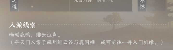 今天想做一做几个门派的攻略,结果除了相思门,无根门能加入。其他好像都不行,也有可能是我没找对方法。有没有大佬指导一下,谢谢了。平天门 入派线索是磁州绯云谷(我找了近一个多小时,没找到)然后试着传送去平天门,往上走了没多远看到了那只鹿,结果上去对话,啥提示都没。求教怎么加入平天门?还有就是丐帮,加入不了还能理解,汴京虹桥乞讨,神龙现世(现在的主线剧情是关外神龙乍现,有可能是还没开)有加入的兄弟