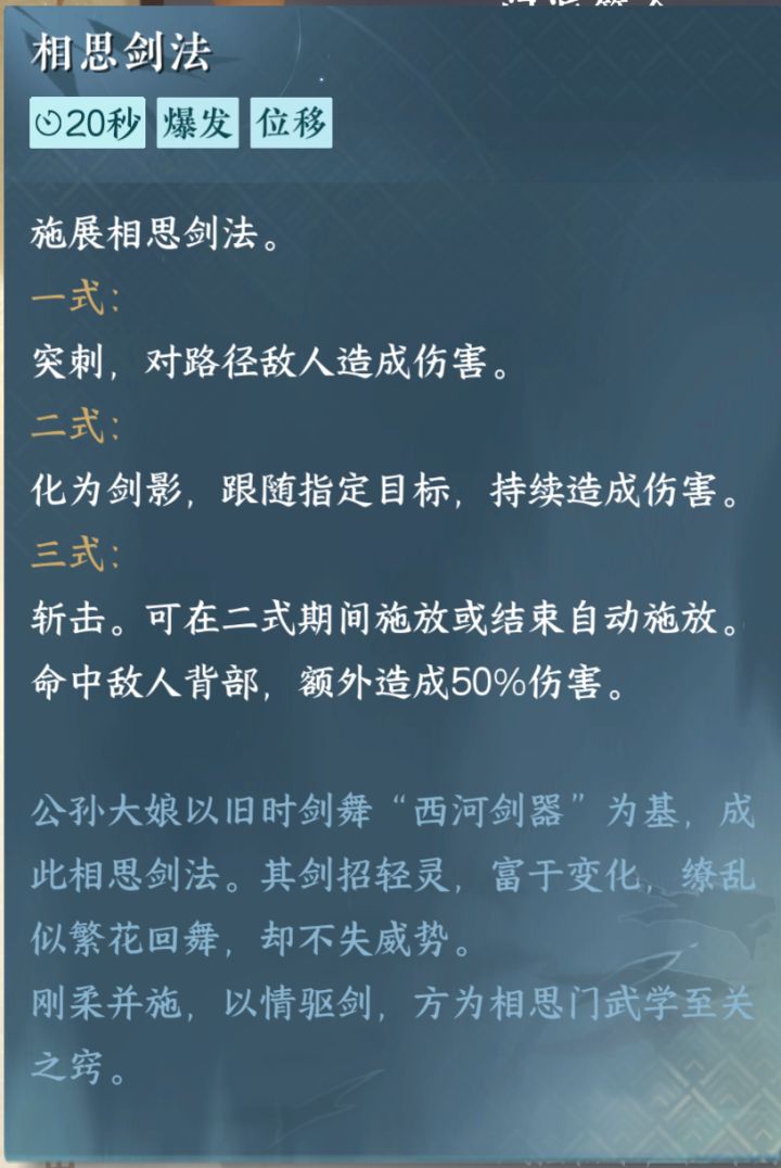 相思门 技能篇相思门技能:相思剑法。拜入相思门即可获得。揽芳相携:需要拥有6名好友且成名赏达到丹虹开霁。一线牵:需要舞蹈6级,成名赏:山水澄辉。万剑诀落英:需要友好度达到披心相付,成名赏:踏歌沧海。相思门入门篇需要学习::”风筝摇“,并且与好友一起。杭州,坐标(942,655)找到接引人。如要进阶技能需要进入相思门地图,过了身后的桥找到执剑人。 无根门技能篇移步生尘:加#寻梦测试攻略征集令