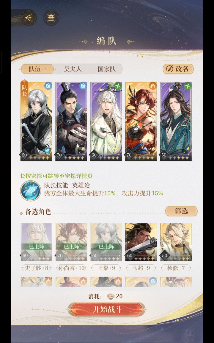 打通的时候孙尚香没到70 可以略低两三级试试 其他全员60+9 视频后面有练度及命盘星石 王粲命盘【同生共死】【技能提供盾】 史子眇命盘【治疗效果大幅提升】【技能提供减伤】 阿蝉命盘【普攻伤害大幅增加】 孙尚香命盘【技能变为群体伤害】 颜良命盘【攻击恢复生命】 tips:打下来的感觉就是狮子喵和颜良的大尽量在boss开大时开,王粲的链子视血量健康与否选择拉与不拉,c的大在boss普攻环节开,只要奶