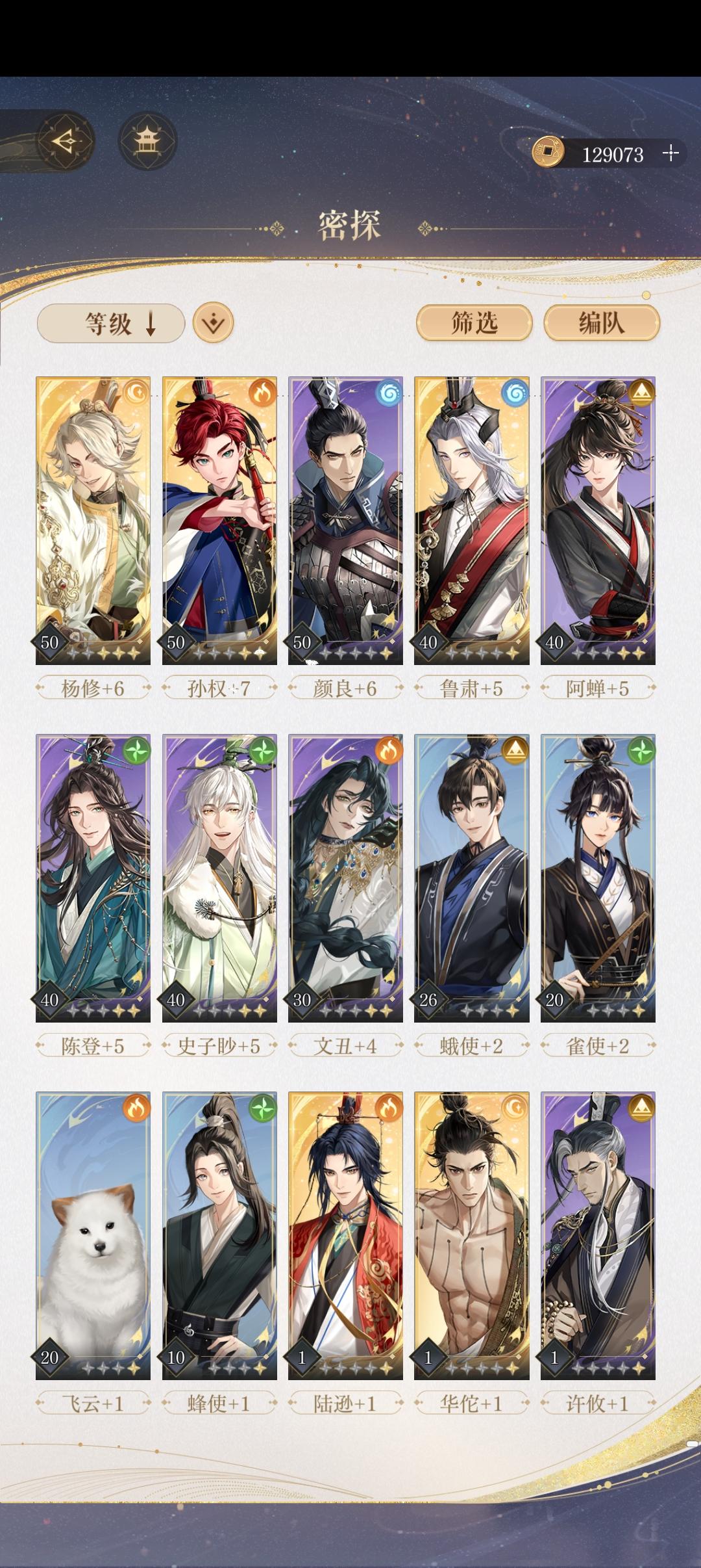 1.徐庶队,得力助手夏侯惇,陈登,其他就是凑神纪岐黄的人数,根据需求搭配。2.张角队,这是一回合打日常跟刷6-24不用手动的队伍,其他常搭配的队友还有盾权,逃课郭嘉。(张角虽脆,但是队友全回血也是爽爽玩的)3.以张飞为首,张邈也是c的普攻队加上孔融以成型。4.对单体不俗的dot队,感觉还缺个大c来引爆,未来可期。5.优先给徐庶,张角,张飞等升级升练度,其次是盾辅,然后就是优先给低星的人权盾