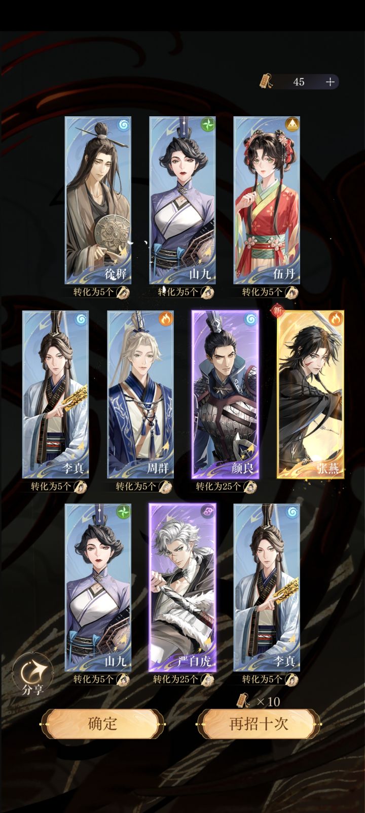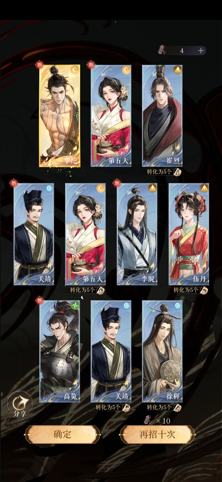 两个号一个号第三十抽贾诩,一个号第四十抽华佗✅遂发TT空间,望周知这俩我都不喜欢,之前玩代号鸢的时候用着还没狂赌之修好用啊我的妈,啥时候我的张飞宝宝回归我手,粲哥来不来我无所谓,毕竟后期抽到也没用了而且中间第二个十抽出了三个紫,没偏差还是出了咱许攸哥不过前面喵哥出了,颜哥登哥出了,这个号感觉还是凑齐国家队了✅还是还是养婵姐吧,零氪玩家呢就不要因为抽卡搞自己的心态