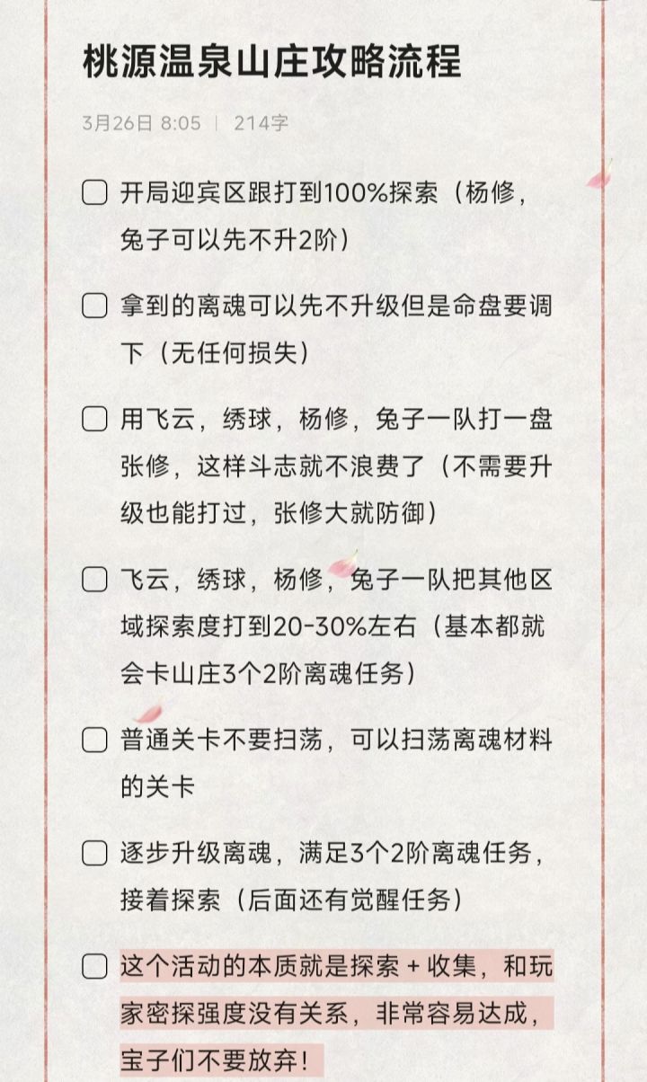 更新超绝友好活动啦,省流见图⚠️这个活动的本质就是探索+收集,和玩家密探强度没有关系,非常容易达成,宝子们不要放弃!以下为开局跟打提示(这个流程走完基本🉑上手了)开局迎宾区跟打到100%探索(杨修,兔子可以先不升2阶)拿到的离魂可以先不升级但是命盘要调下(无任何损失)用飞云,绣球,杨修,兔