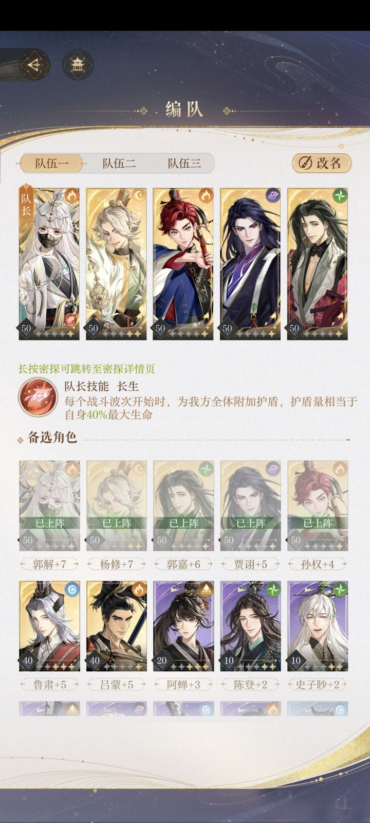 杨修+孙尚香+孙权+阿婵+陈登(50+7为主) 全员输出,不带奶盾,boss只会奶自己不会普攻你 无对策密探过关只有两点!高输出+运气!!! 这关我打了好多遍,一开始我的输出根本不够! 我做了什么事呢? ①把所有密探身上的星石拆下来了,按照密探输出优先级开始安输出石头,我的输出主力是香香,其次要靠杨修赌骰,再是阿婵稳定输出,给孙权装剩下的,轮到陈登就剩一星的太阴还有一个忘记了,可以参考一下我的星石