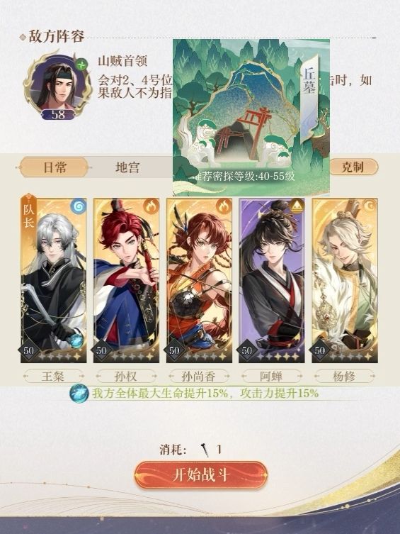 孙权+孙尚香+阿婵+王粲+杨修 必要:一火一土+辅助位+两个辅助输出 最好多上火,没有火了就要赌暴击 尽量不要上被属性克制的密探,打不出伤害 本来除了火土,其他属性都被削了,克制更难受 比如我这里上的杨修就是个添头,大招还不如人家普攻呢嘻嘻 ⚠️细节注意 ①由于俩boss只攻击2、4号位,这两个密探多堆生命,我是把生命值最高的星石都拆下来给他俩了 ②多堆火、土密探攻击,赌暴击,不然有可能超15回合
