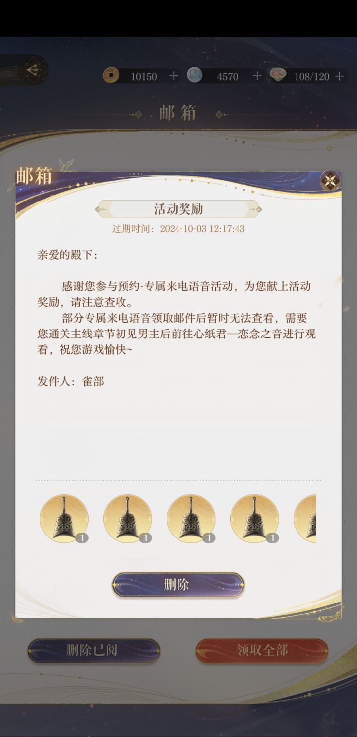 心纸君里只有菜单,但是邮件收到了五个男主的,打不开,领取的时候没下载点错了#如鸢 #如鸢国服 #如鸢归鸿公测定档0926 #如鸢电话预约 #如鸢定档公测9月26日 #如鸢归鸿公测 #如鸢定档9月26日 #如鸢归鸿公测定档