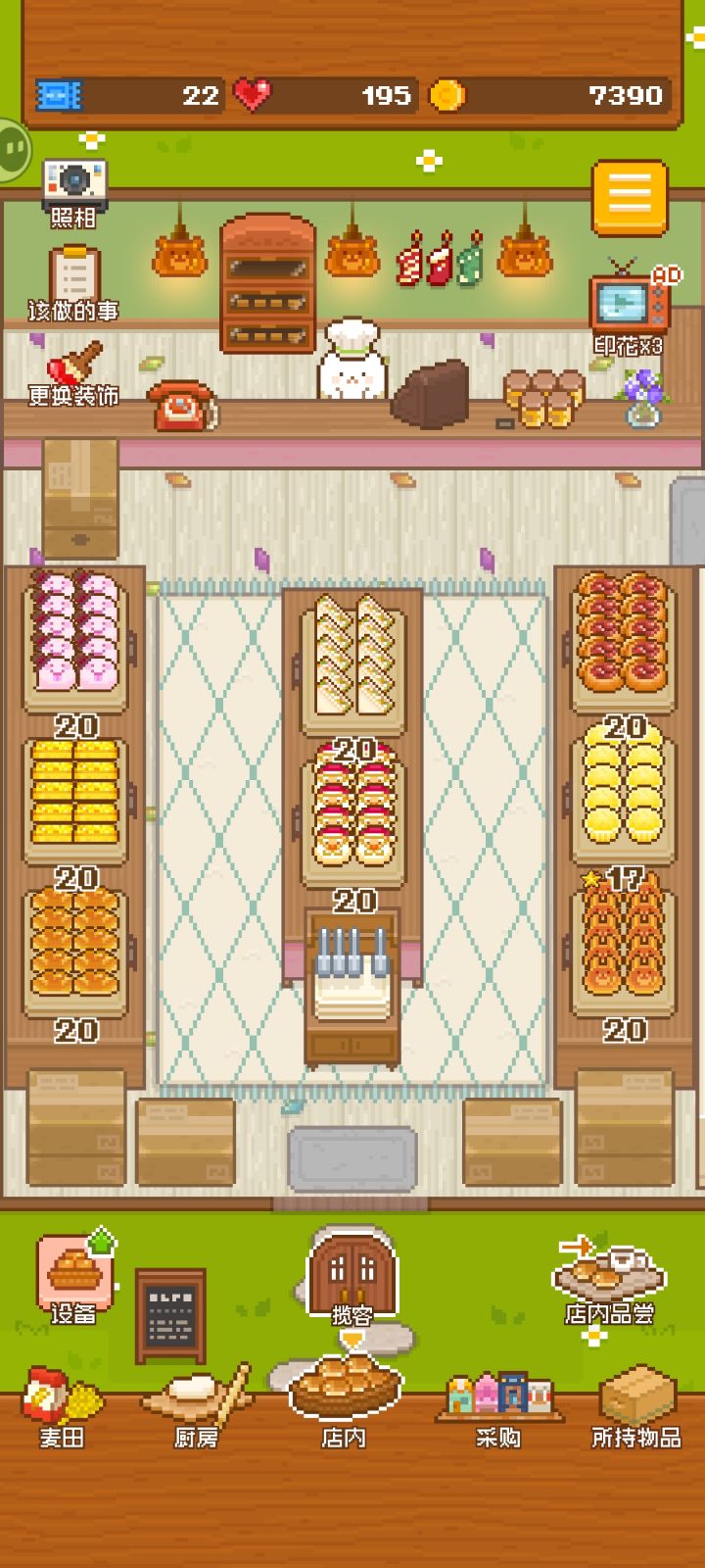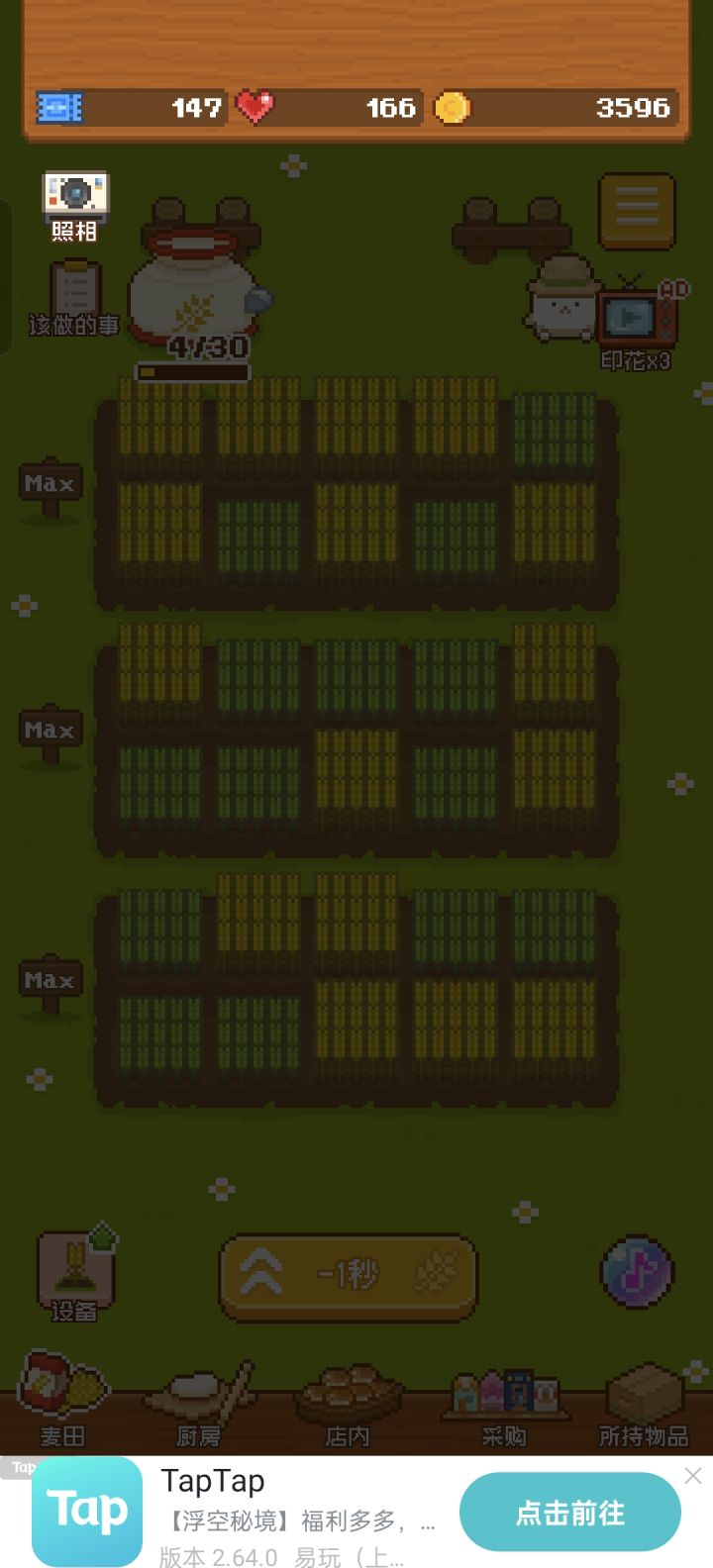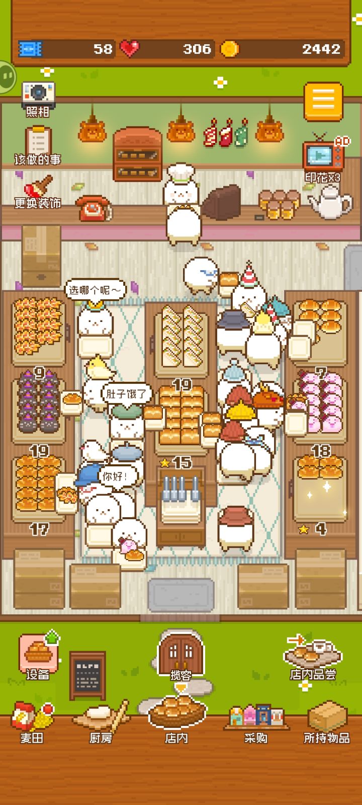 太好玩啦!!这是我玩的第二天给大家说说我的经验吧。首先是金币。金币的获取主要是:卖面包、抽奖中心抽奖(六等奖)、做任务奖励、电话外卖获取,以及玩时间长了的话会弹出来看个广告休息一下(ps:这个广告是可以跳过的)会获得100金币。金币多了建议先升麦田,仓库(可以升一两级就够用了),烤面包的炉子(先升数量再升速度)。剩下的卖面包的格子看自己情况升。其次是爱心。爱心获取:任务、抽奖中心、厨房里飞着的