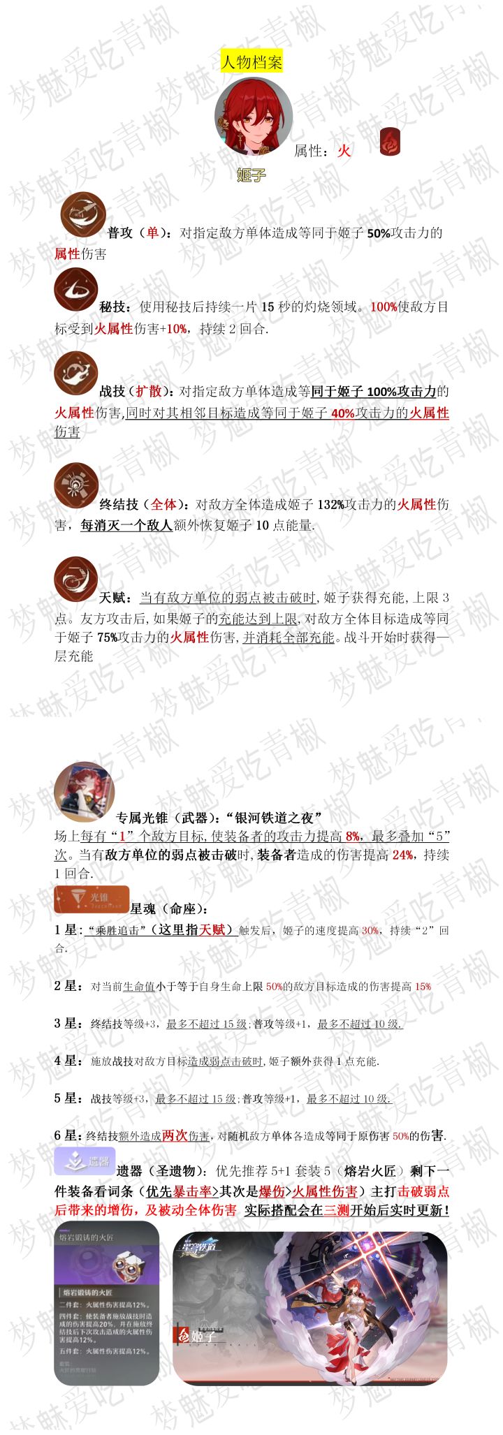 如图上是关于“姬子”的技能跟基础的搭配介绍,会在接下来的三测慢慢完善(大爱我姬子阿姨!)欢迎大家2月10号来虎牙11148587直播间玩!#游戏图文新春挑战#攻略#《崩坏:星穹铁道》测试#崩坏星穹铁道#姬子