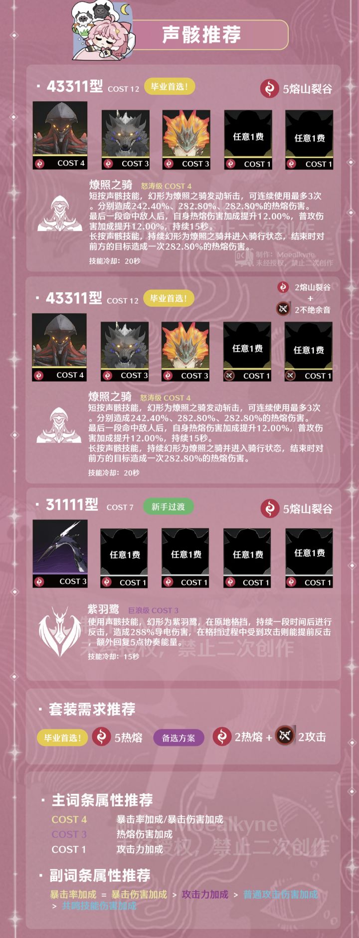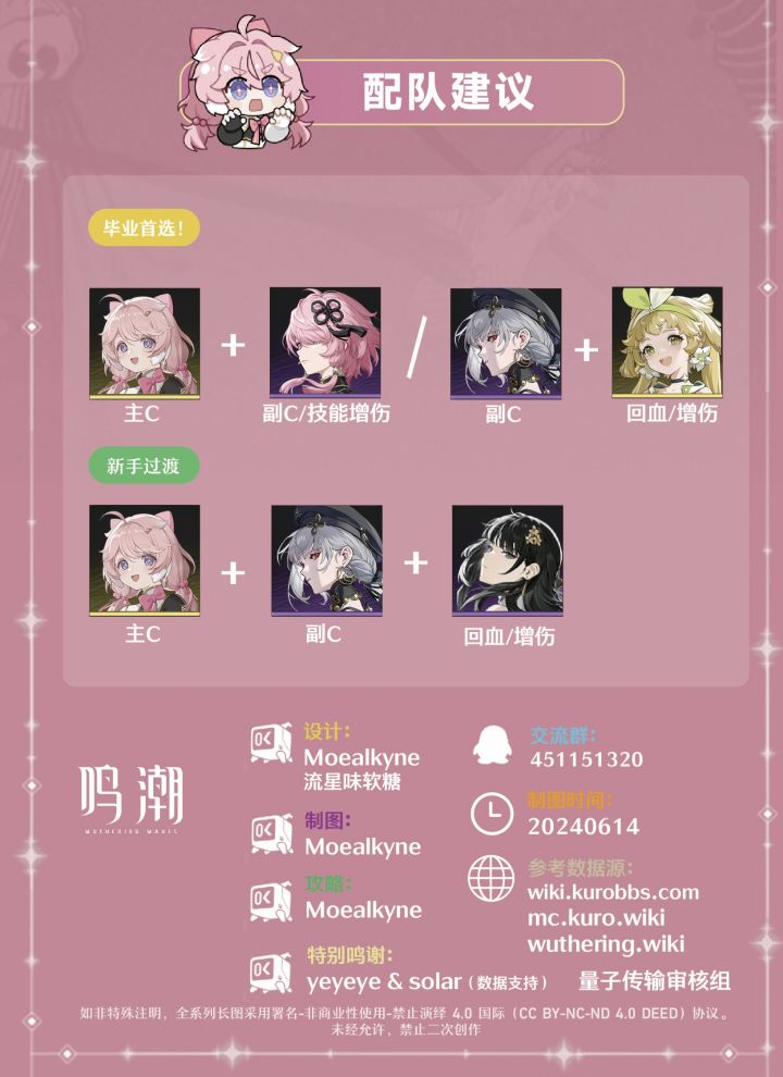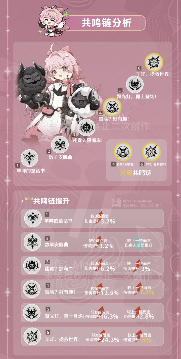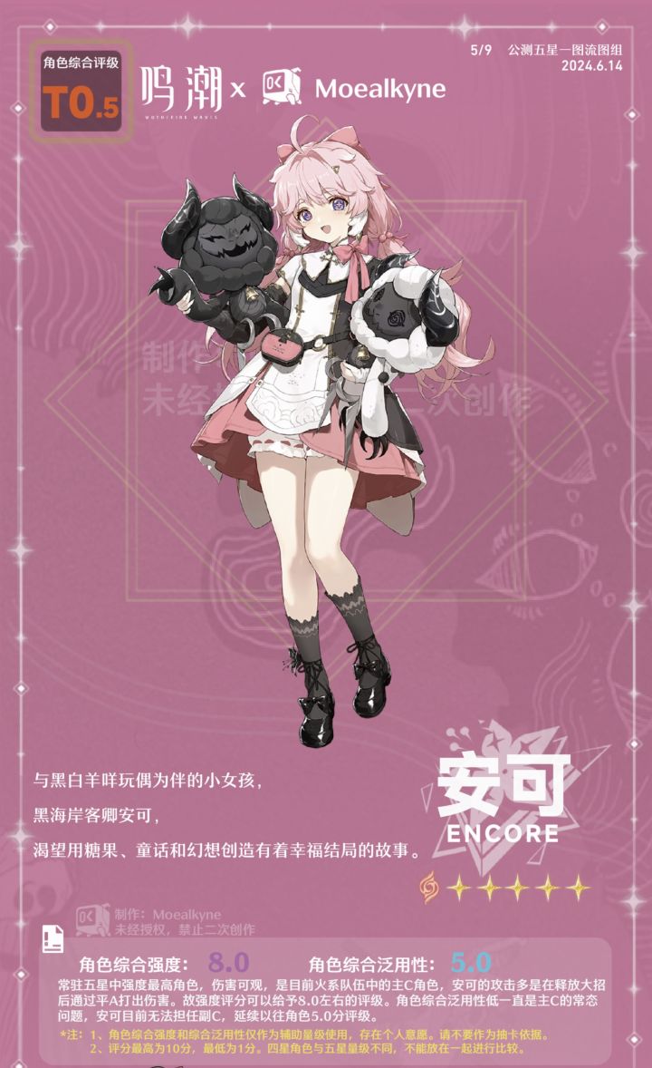 【此角色一图流适用公测!相关数据已经过库街区wiki查询~】【公测UID:100532881】公测翻新一览1、修正武器推荐,新增武器优先度。2、修改43311型型声骸推荐。3、修改副词条加点推荐。4、新增共鸣链提升值。5、修复若干bug各位漂泊者早上中午晚上好呀,这里是熬夜作图两小时的Moealkyne,本次给大家带来的是「安可」角色一图流攻略公测翻新版本~与黑白羊咩玩偶为伴的小