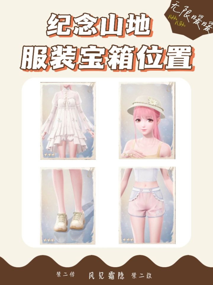 纪念山地共计4个服装宝箱p2连衣裙:芬芳遐想p3裤子(短):灵巧跳跃p4鞋子:旅人之鞋p5帽子:花语希望持续更新攻略,点赞收藏不迷路哟~ #无限暖暖 #无限暖暖全球公测 #无限暖暖攻略 #无限暖暖攻略征集 #暖暖nikki #宝箱