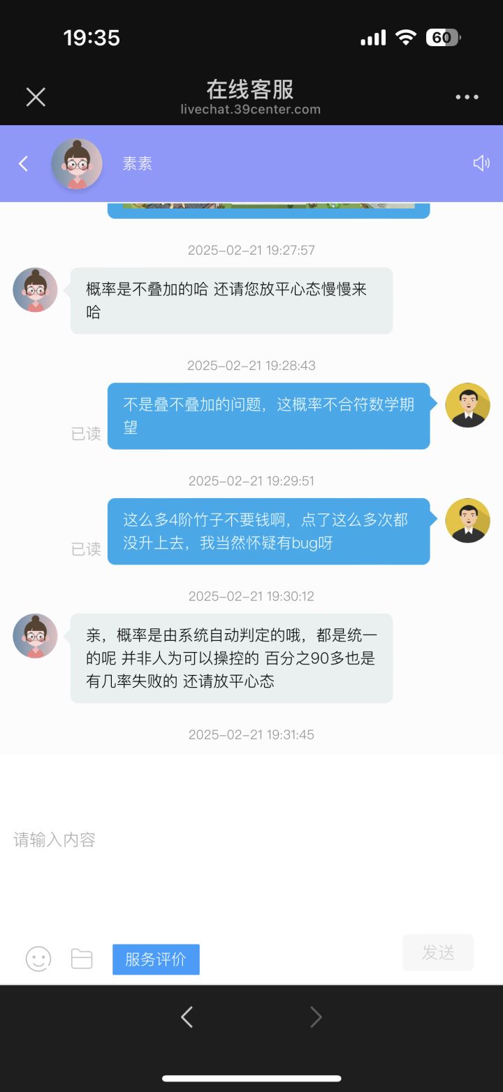 我在游戏中尝试将3阶法宝晋升4阶,每次晋升需要100个材料,官方公布的成功率为34%。我准备了1000个材料,连续尝试了10次,结果全部失败。根据游戏显示的34%成功率,连续10次失败的概率仅为1.57%(0.6610≈1.57%0.6610≈1.57%)。这种极端结果已经远远超出了合理的随机范围,有理由怀疑实际概率与显示不符。我向客服反馈此问题后,客服仅回复‘概率是随机的,无法处理’,完全无
