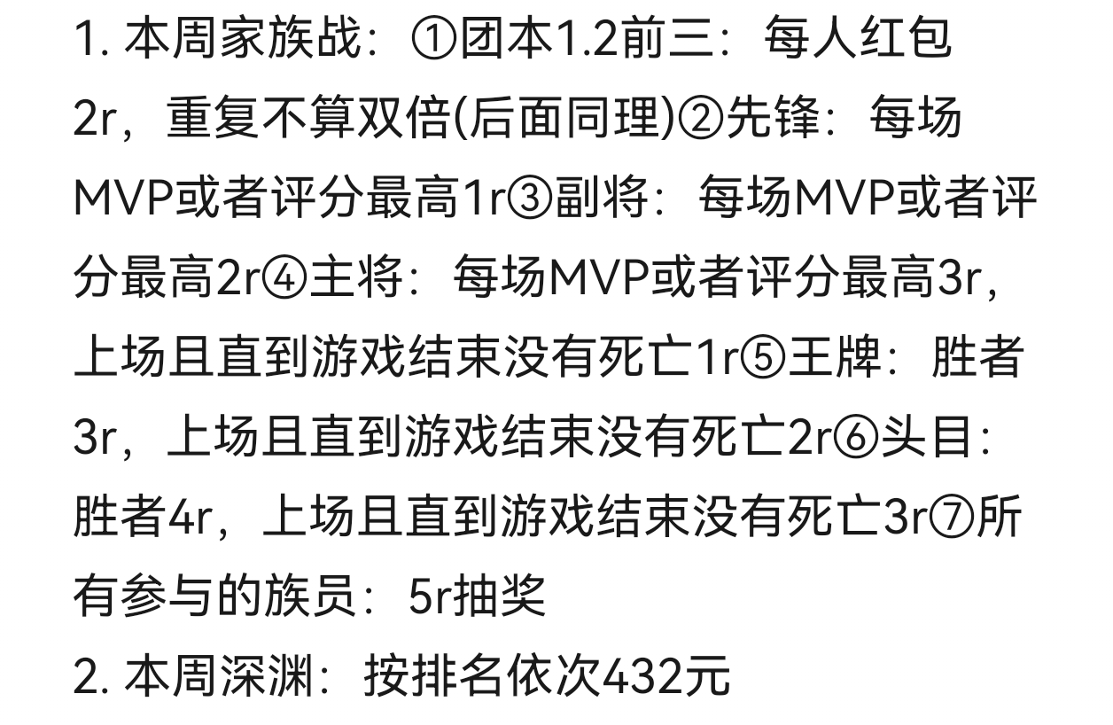 一、进族要求1. 参与每周族战,深渊(非强制,可请假)2. 单角色面板过3500,至少一个二命三体人,一套ss专宝。3. 服从族长和管理员安排,进群遵守纪律。二、本周家族奖励1. 家族战:①团本1.2前三:每人红包2r,重复不算双倍(后面同理)②先锋:每场MVP或者评分最高1r③副将:每场MVP或者评分最高2r④主将:每场MVP或者评分最高3r,上场且直到游戏结束没有死亡1r⑤王牌:胜者