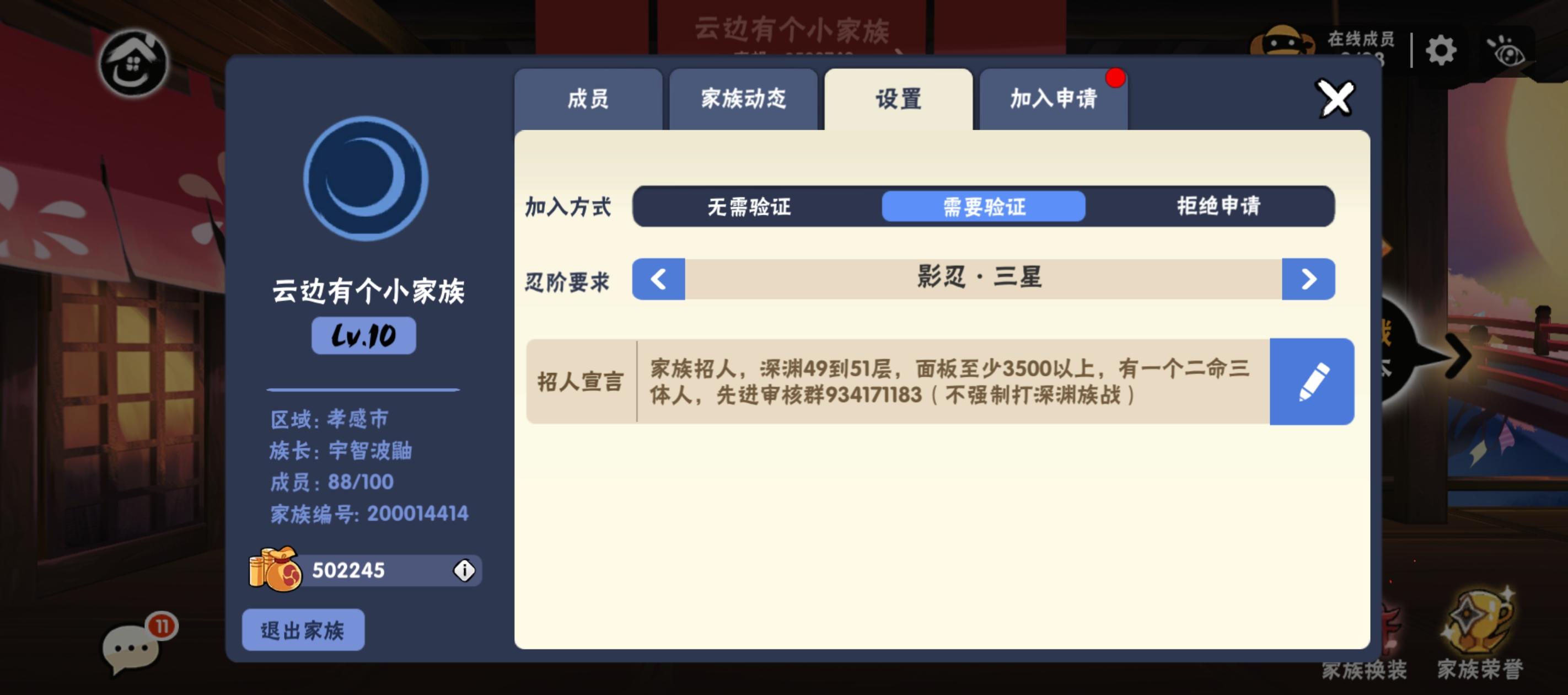 一服家族招人!大家都很佛系,深渊族战没啥要求,能来最好了,平常就大家伙一起唠唠嗑啥的就好喽(忍阶改为超二啦!)#忍者必须死3#家族招人#佛系