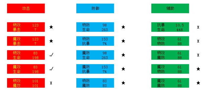 ⭐代表最佳 √代表可用 X代表建议分解输出:副词条:百分比攻击简称大攻,暴击,爆伤,固定攻击简称小攻主词条:A. 7红(861攻49%爆)B.6红1蓝。开12%爆伤(738攻42%爆12%伤,83双防)C.6红1绿。开8%暴击(799攻50%爆,88单防)如果有人要问123攻击力和12%爆伤哪个输出高。在一定暴击的前提下。对于你绿字(进图以后属性后面的绿色字体)高于40%的前提下或者